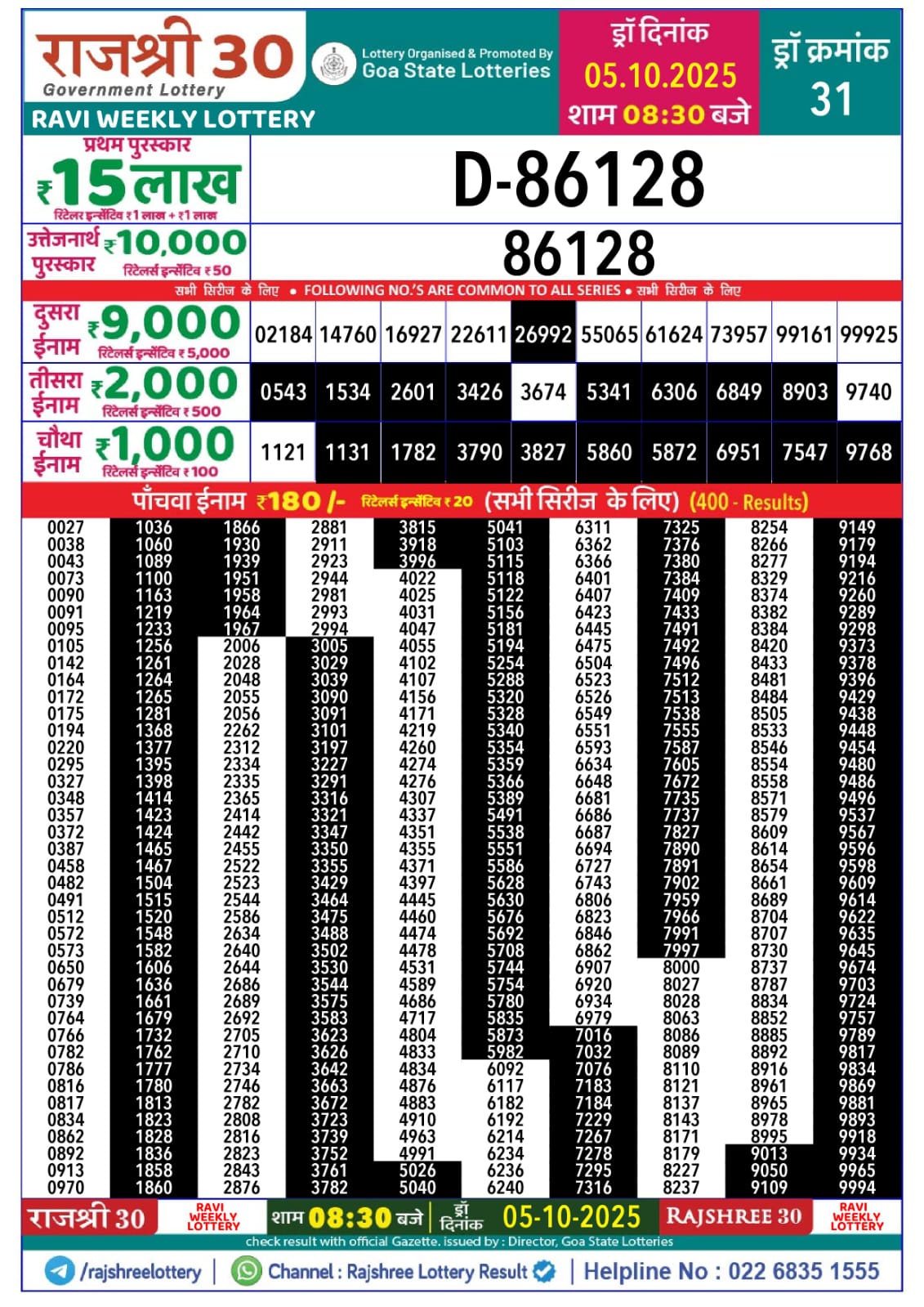 Rajshree 30 Lottery 8:30pm Daily Result 05 October 2025