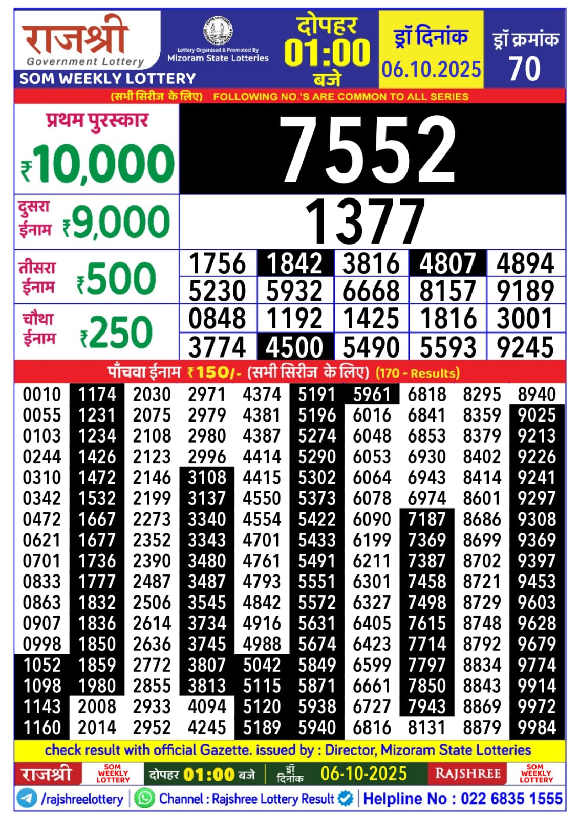 Rajshree Som Weekly Lottery 1pm Result 06 October 2025