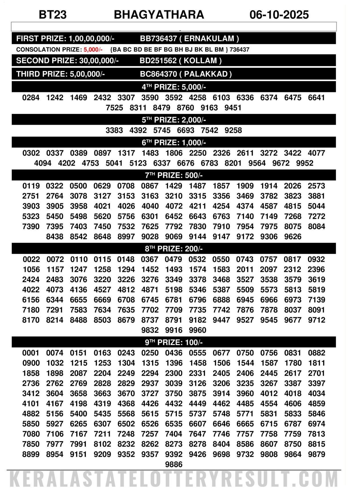 Bhagyathara BT-23 Prize List: Kerala Lottery Result for  Today 06 October 2025