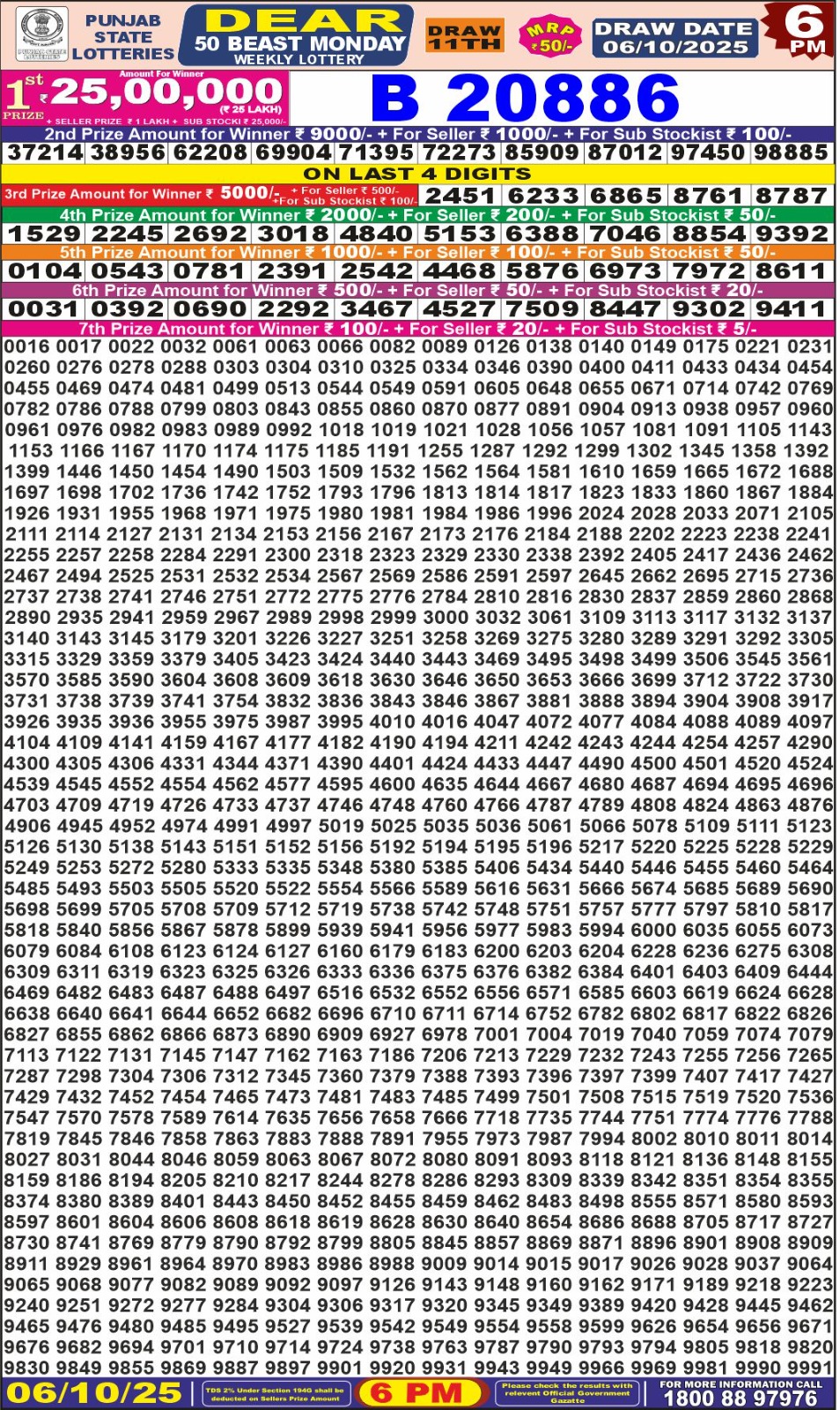 Punjab State Dear 50 6pm Weekly Lottery 06 October 2025