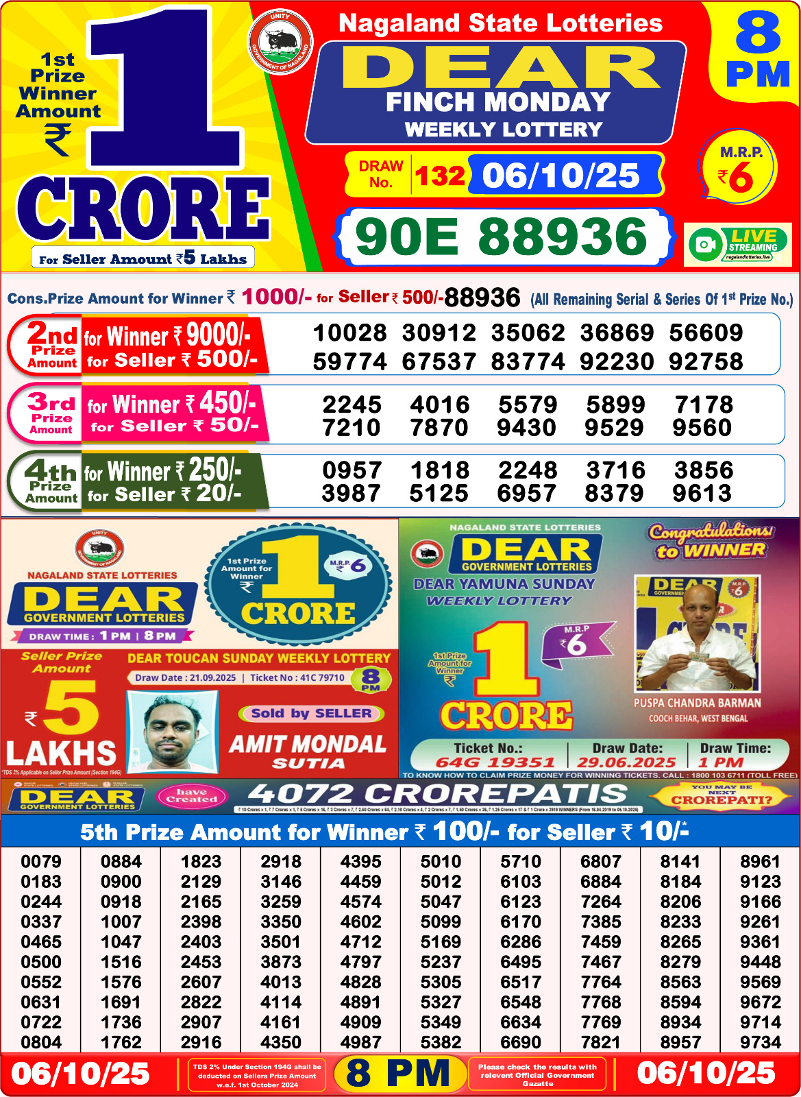 Dear Finch Lottery 8pm Daily Result 06 October 2025