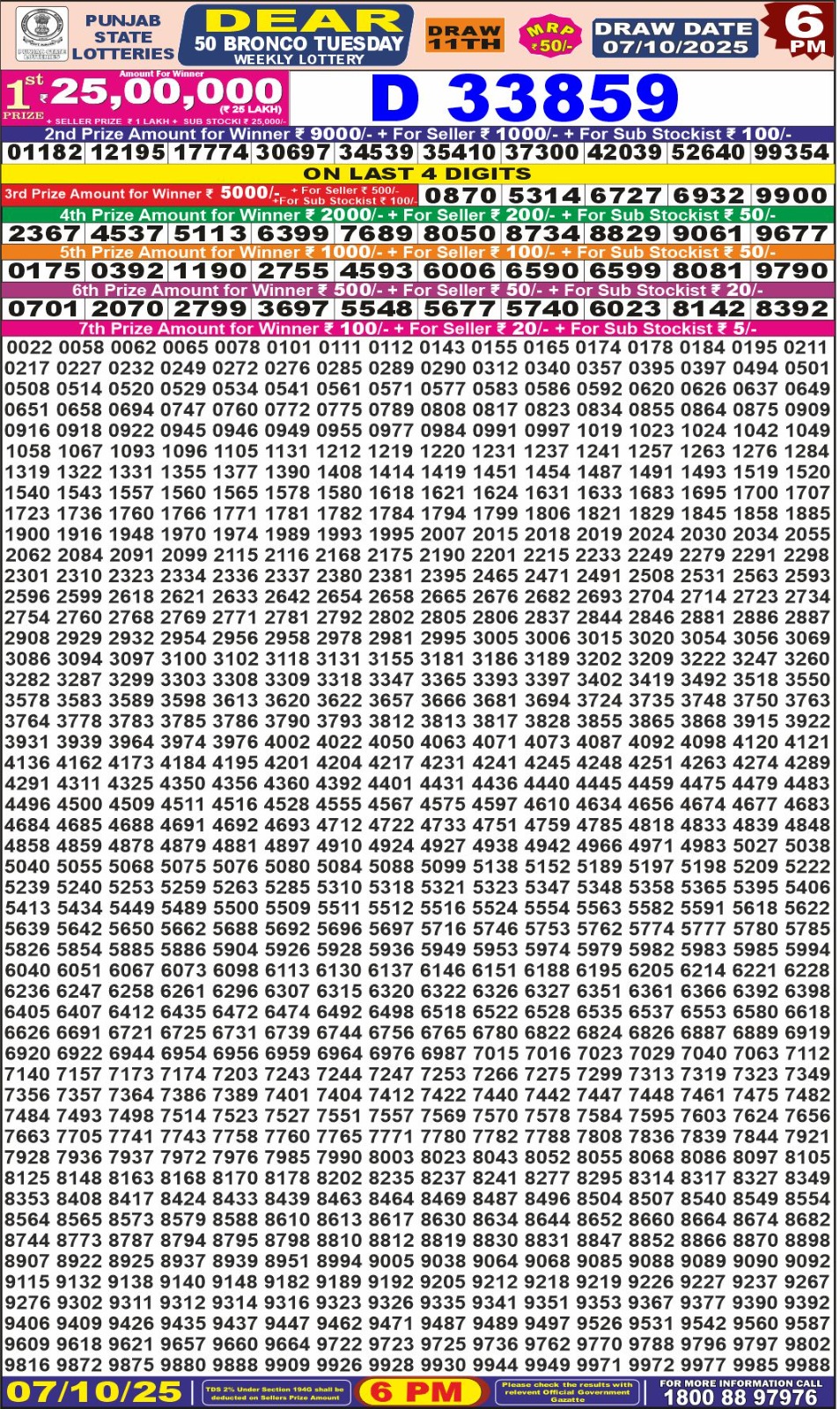 Punjab State Dear 50 6pm Weekly Lottery 07 October 2025