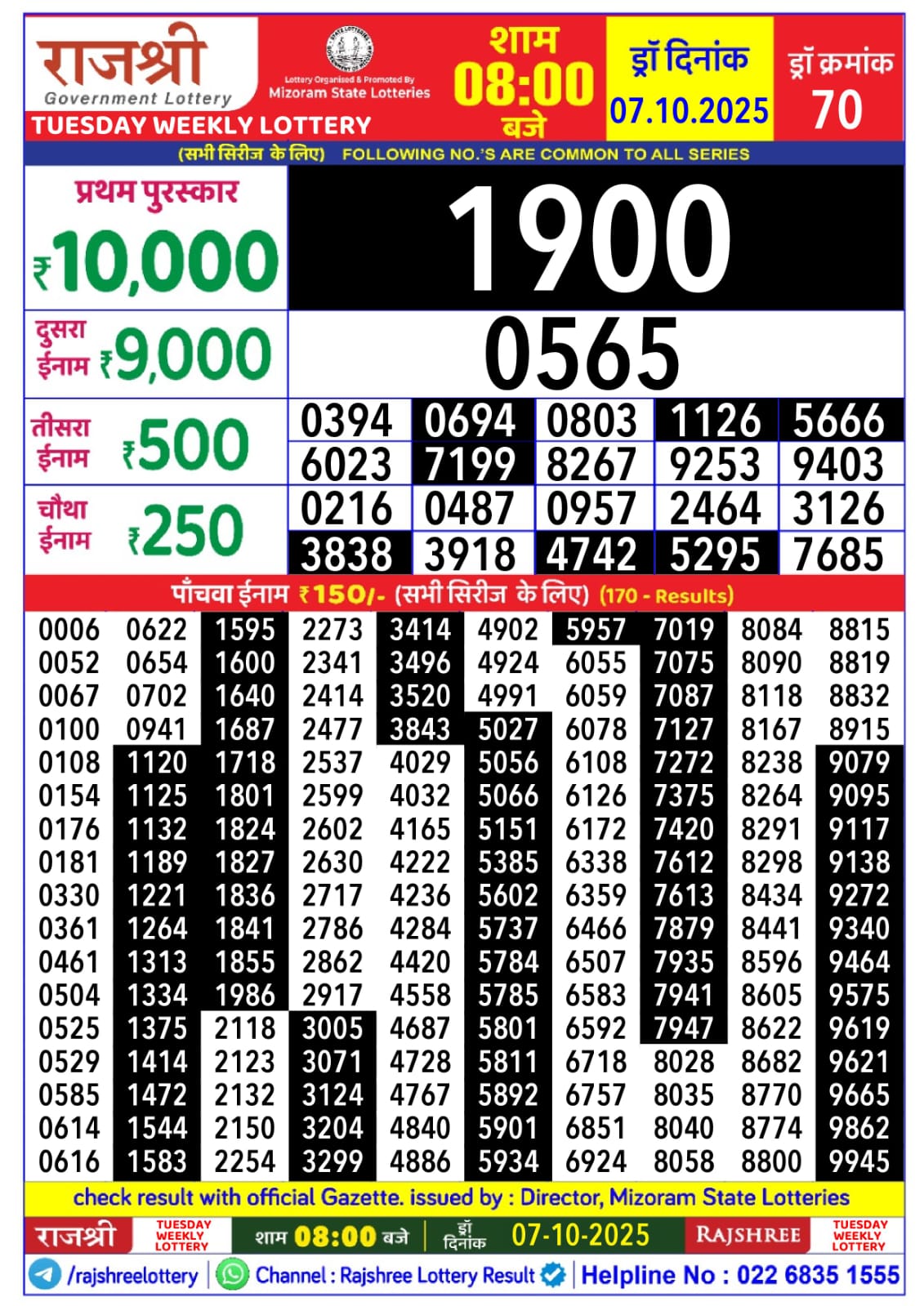 Rajshree Mangal Lottery 1pm Daily Result 07 October 2025