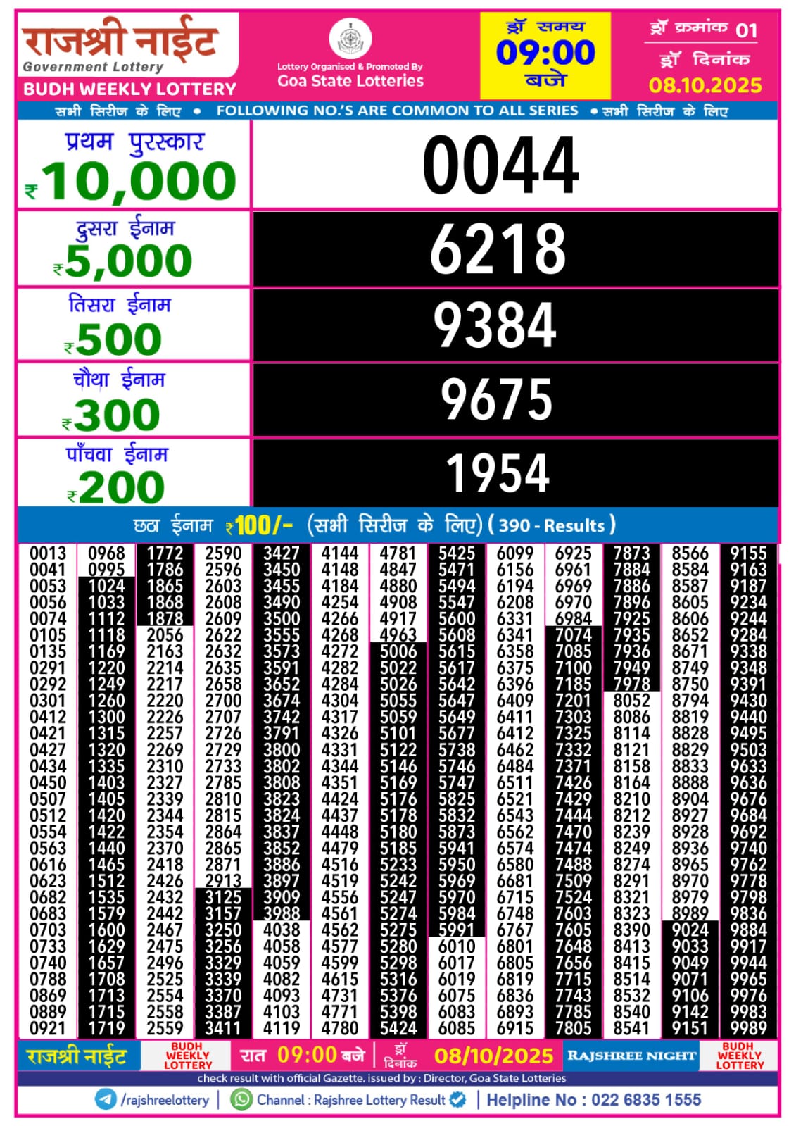 Rajshree Budh Lottery 1pm Daily Result 08 October 2025