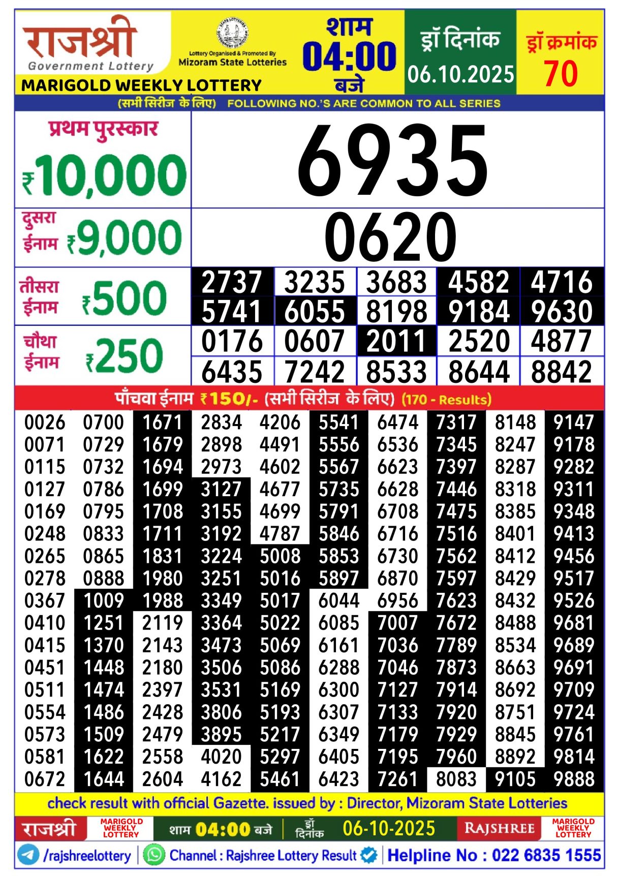 Rajshree Marigold Lottery 4pm Daily Result 06 October 2025