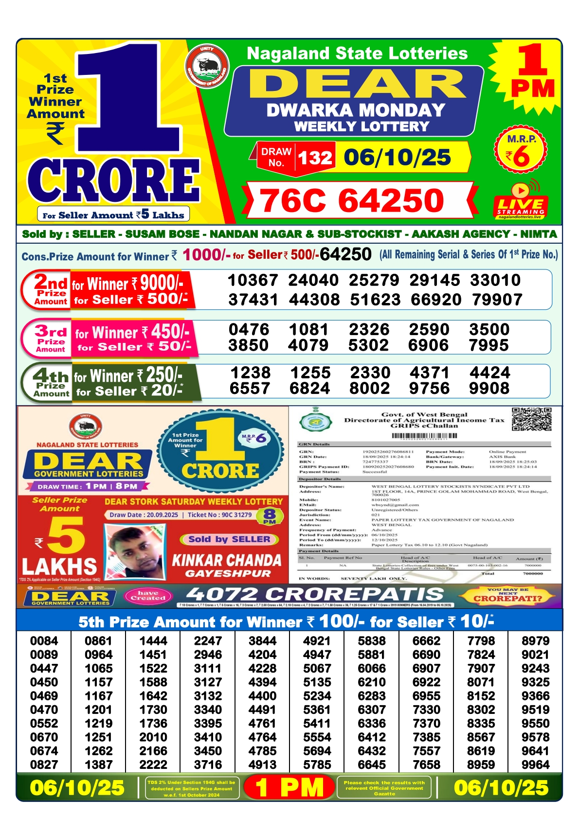 Dear Dwarka Lottery 1pm Daily Result 06 October 2025