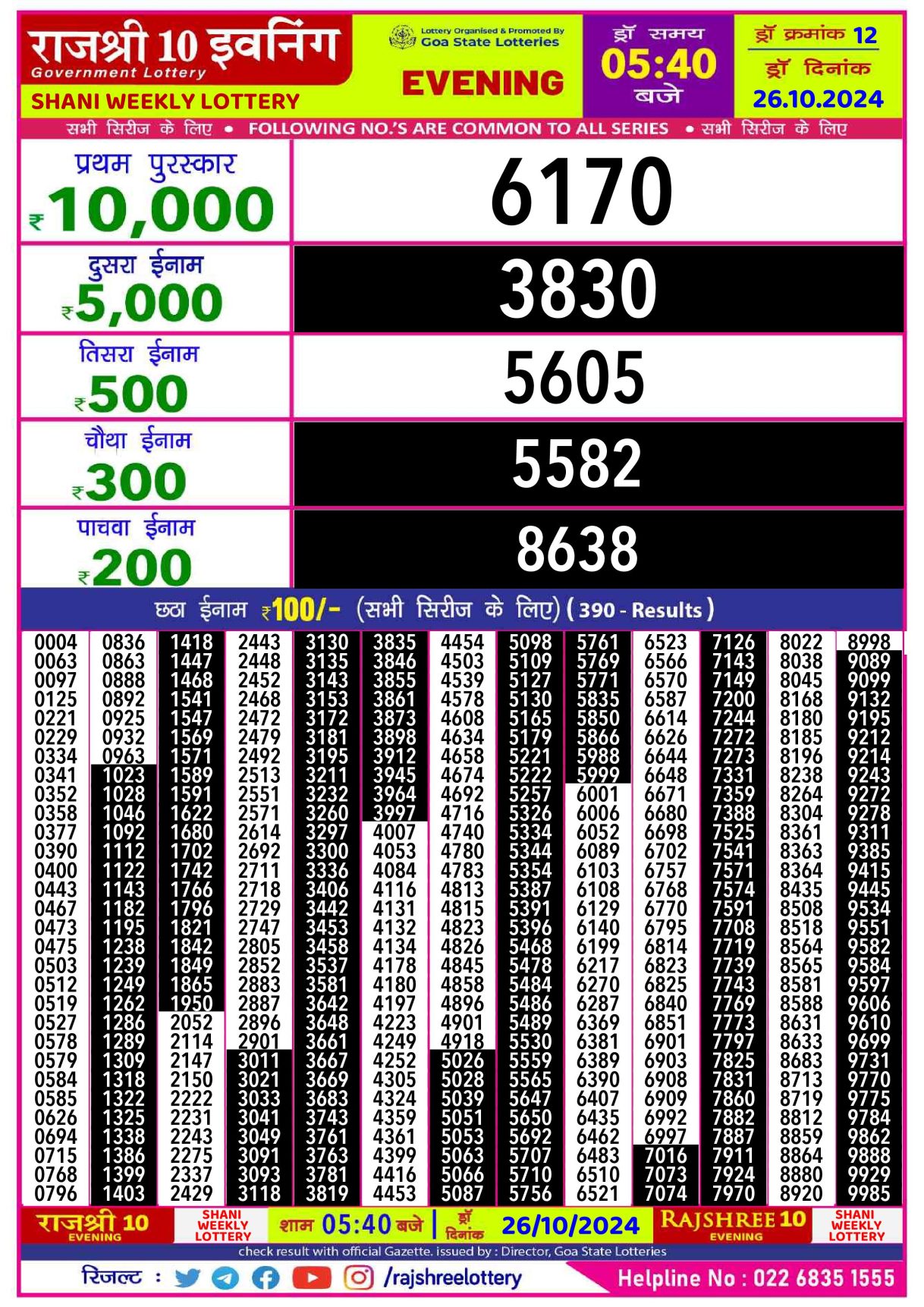 Rajshree10 Evening  Weekly 5:40 pm lottery result 26.10.24