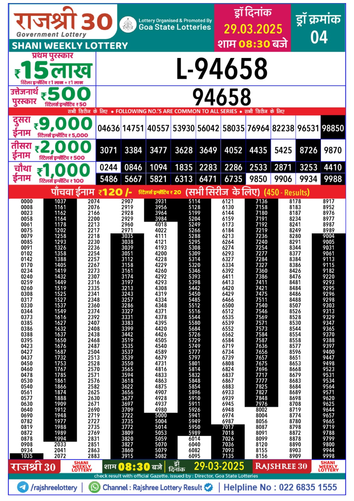 Rajshree ravi Lottery 1PM Daily Result  30 March 2025