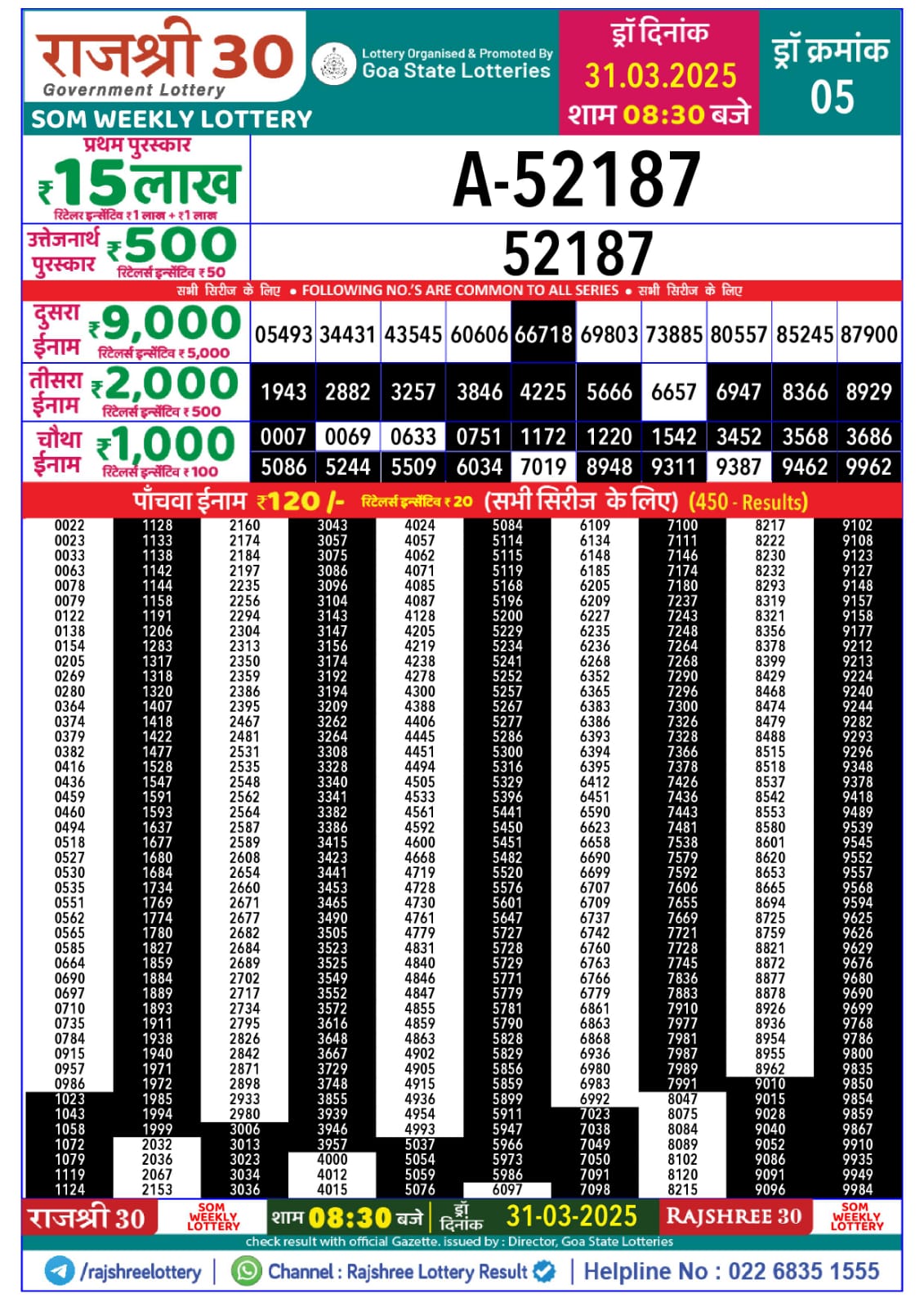 Rajshree Som Weekly Lottery 1PM Result 31 March 2025