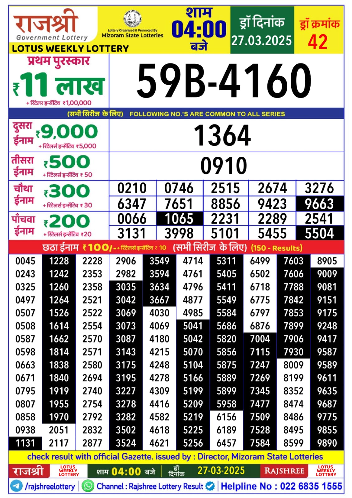 Rajshree lotus Lottery 4PM Daily Result 27 March 2025