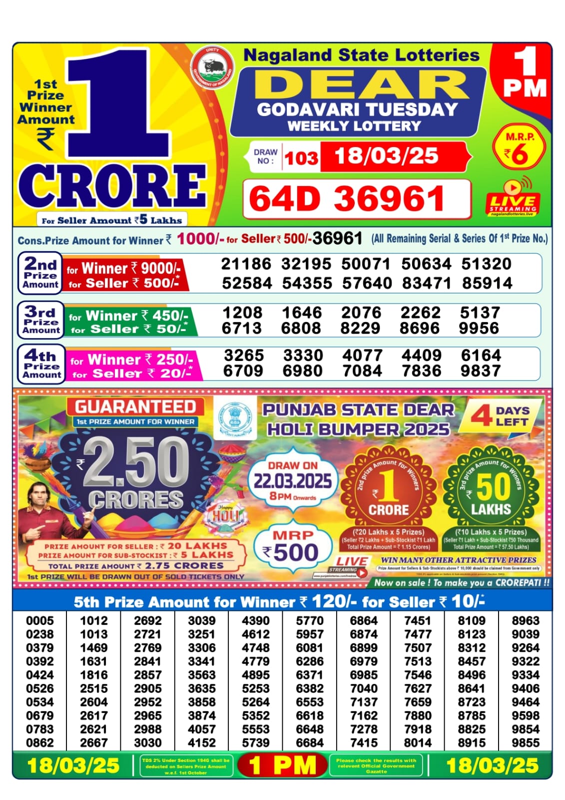Dear godavari Lottery 1PM Daily Result 18 March 2025