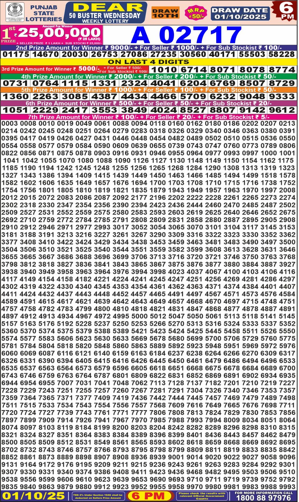 Punjab State Dear 50 6pm Weekly Lottery 01 October 2025