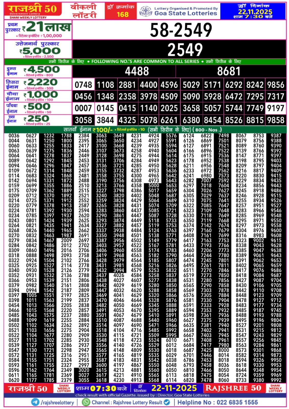 Rajshree 50 Lottery 7:30pm Daily Result 22 November 2025