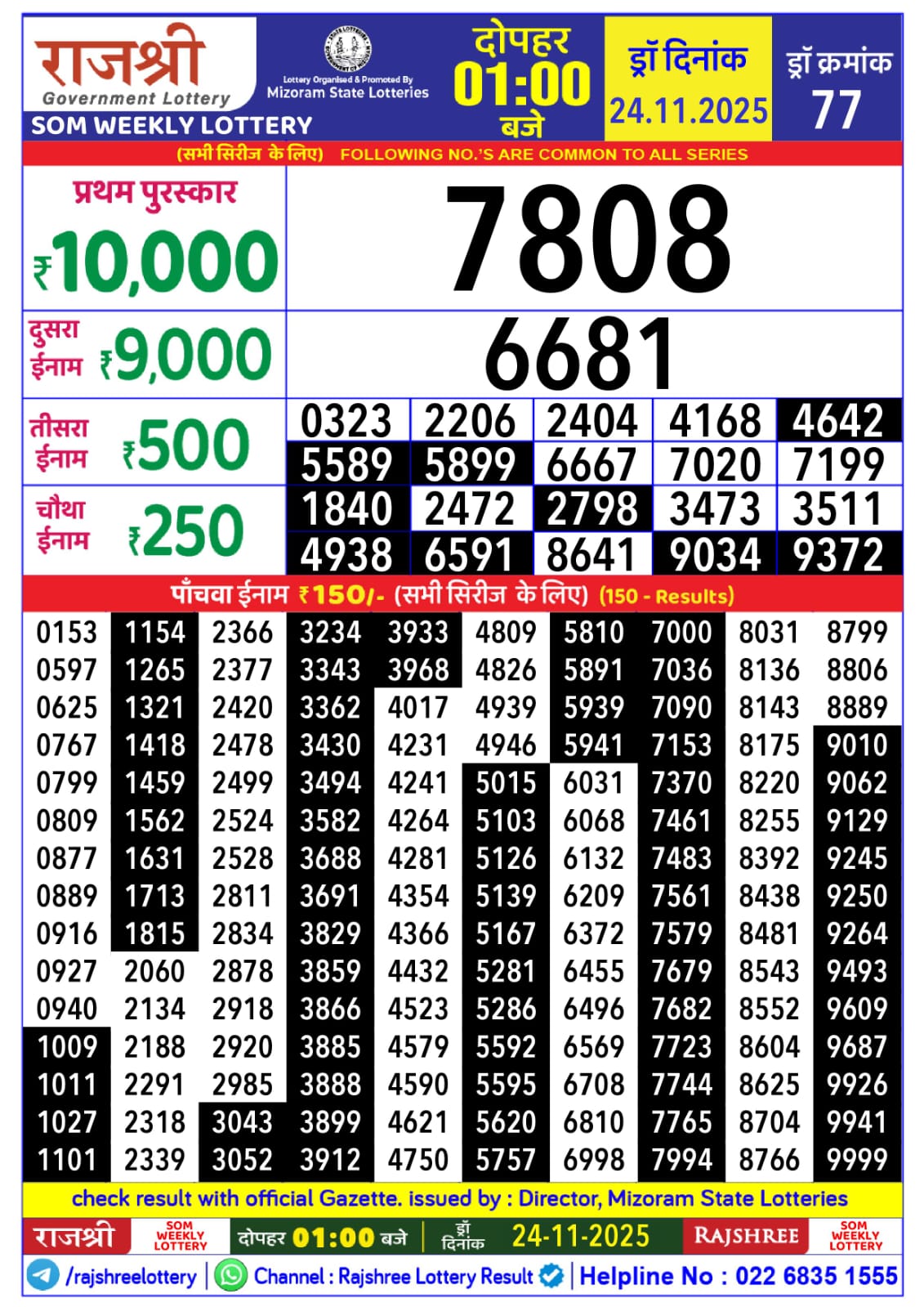 Rajshree Som Weekly Lottery 1pm Result 24 November 2025