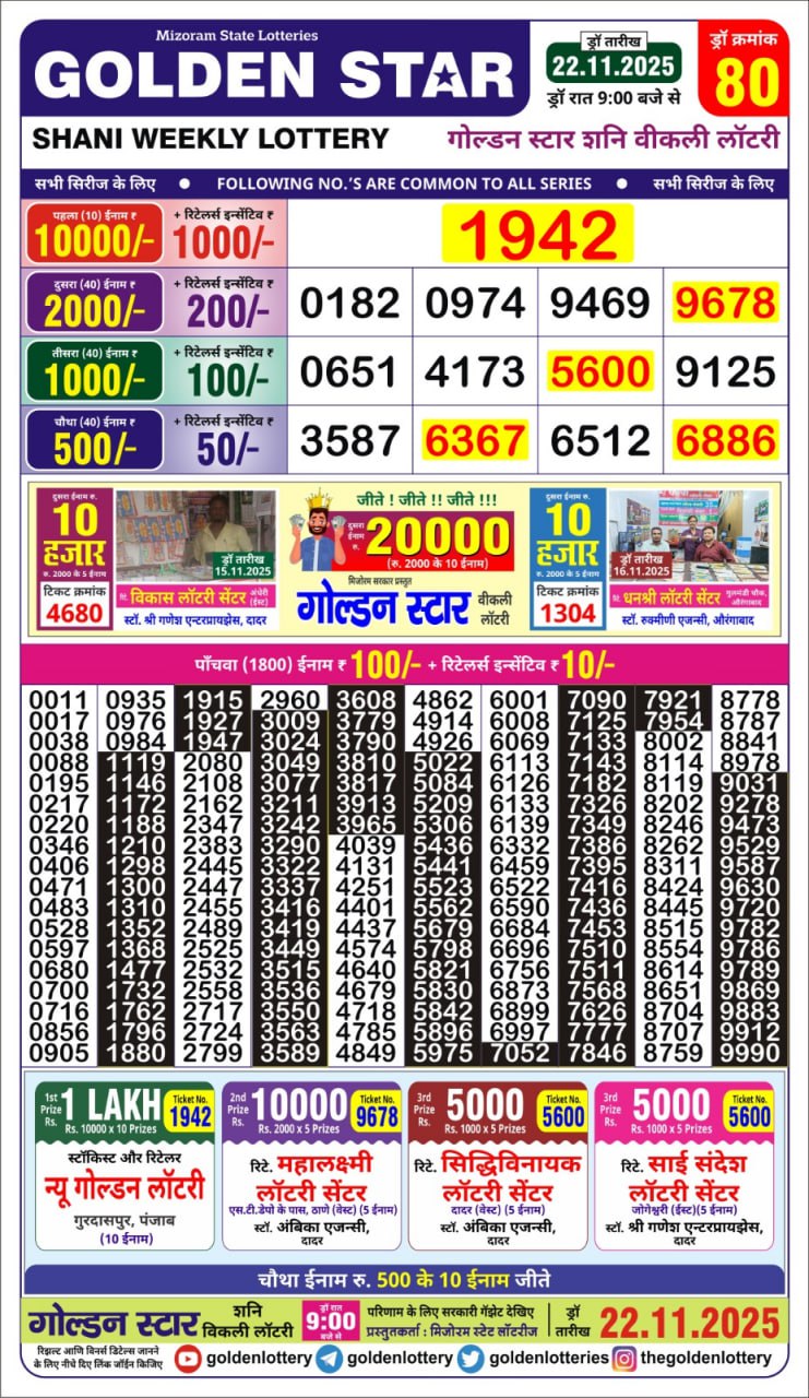Golden Star Weekly 9pm Lottery Result 21 November 2025
