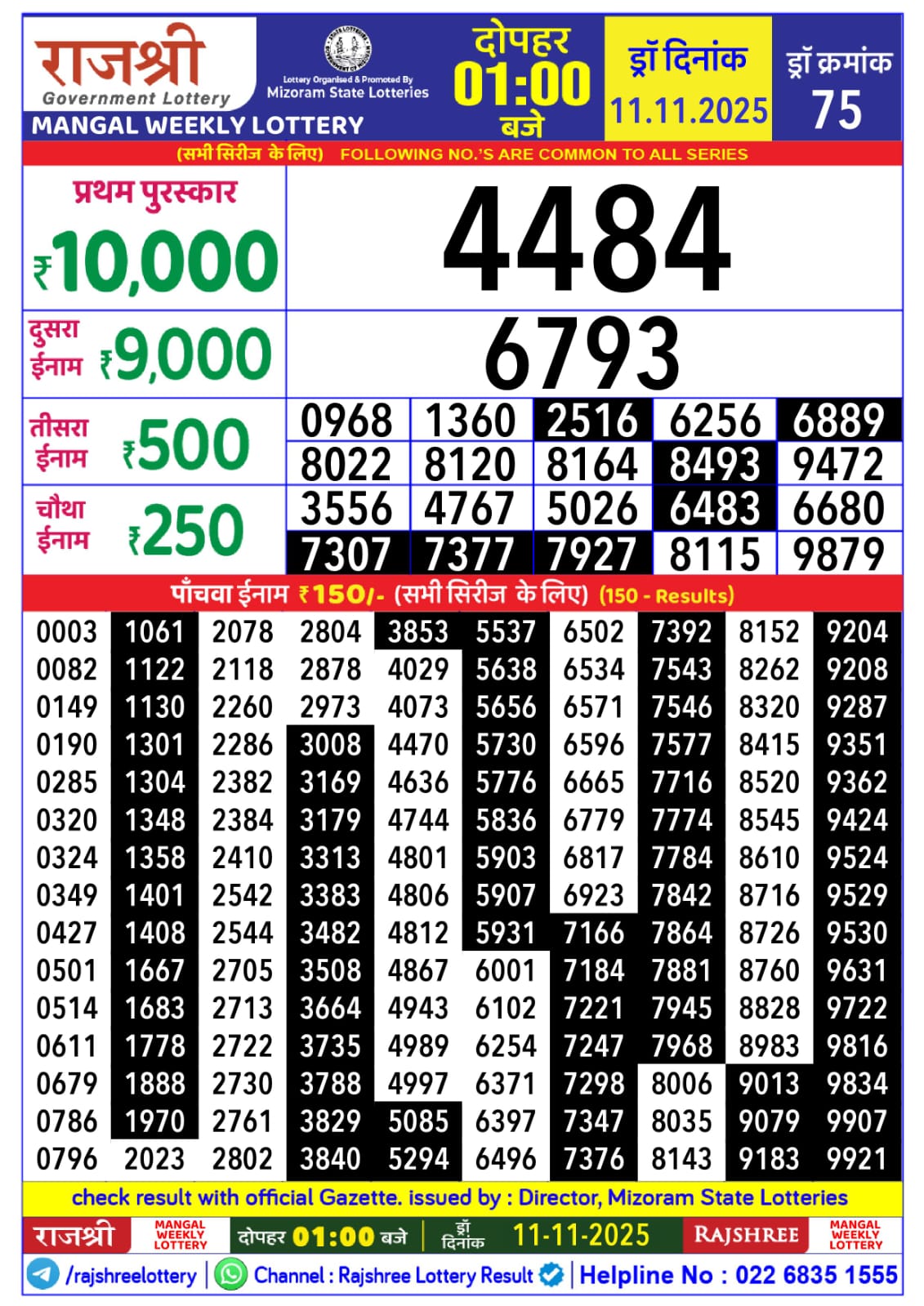 Rajshree Mangal Lottery 1pm Daily Result 11 November 2025