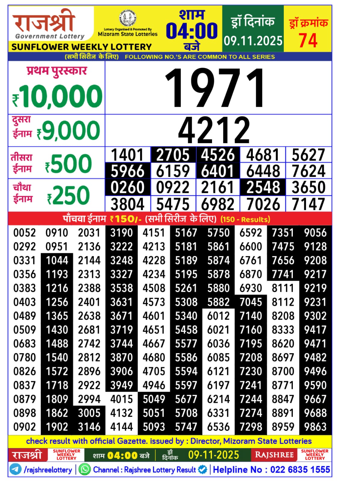 Rajshree Sunflower Lottery 4pm Daily Result 09 November 2025