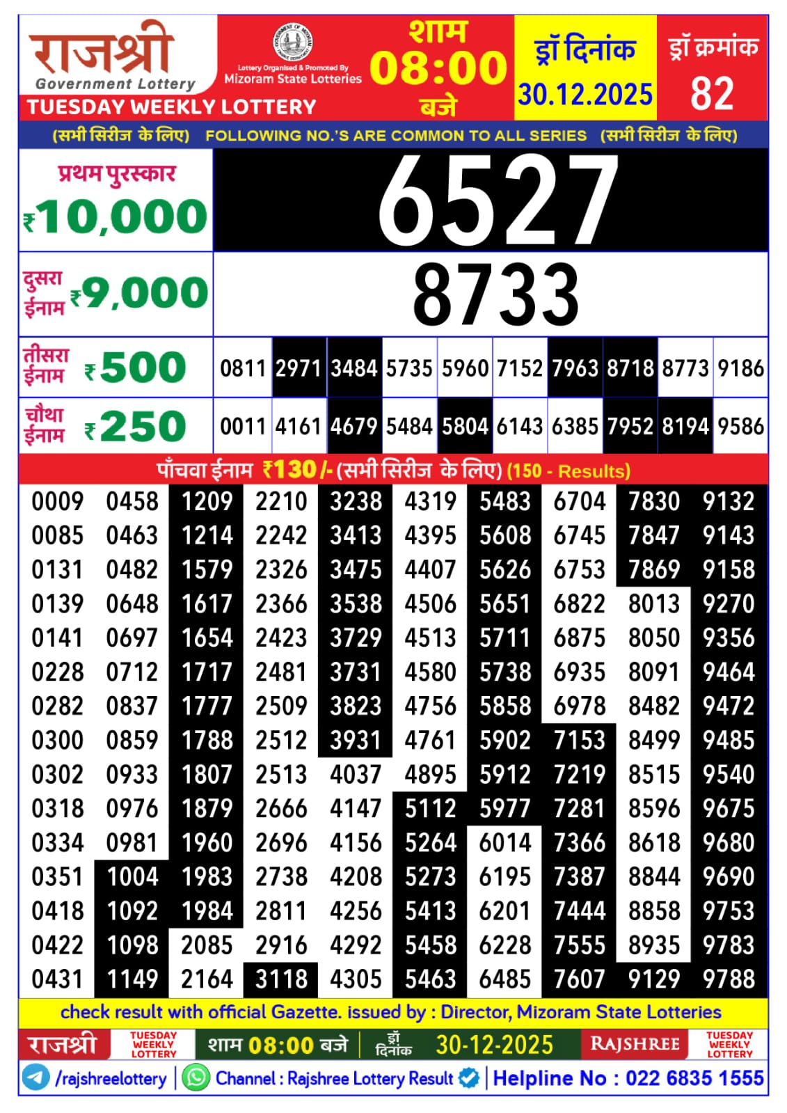 Rajshree Lottery 8pm Daily Result 30 December 2025