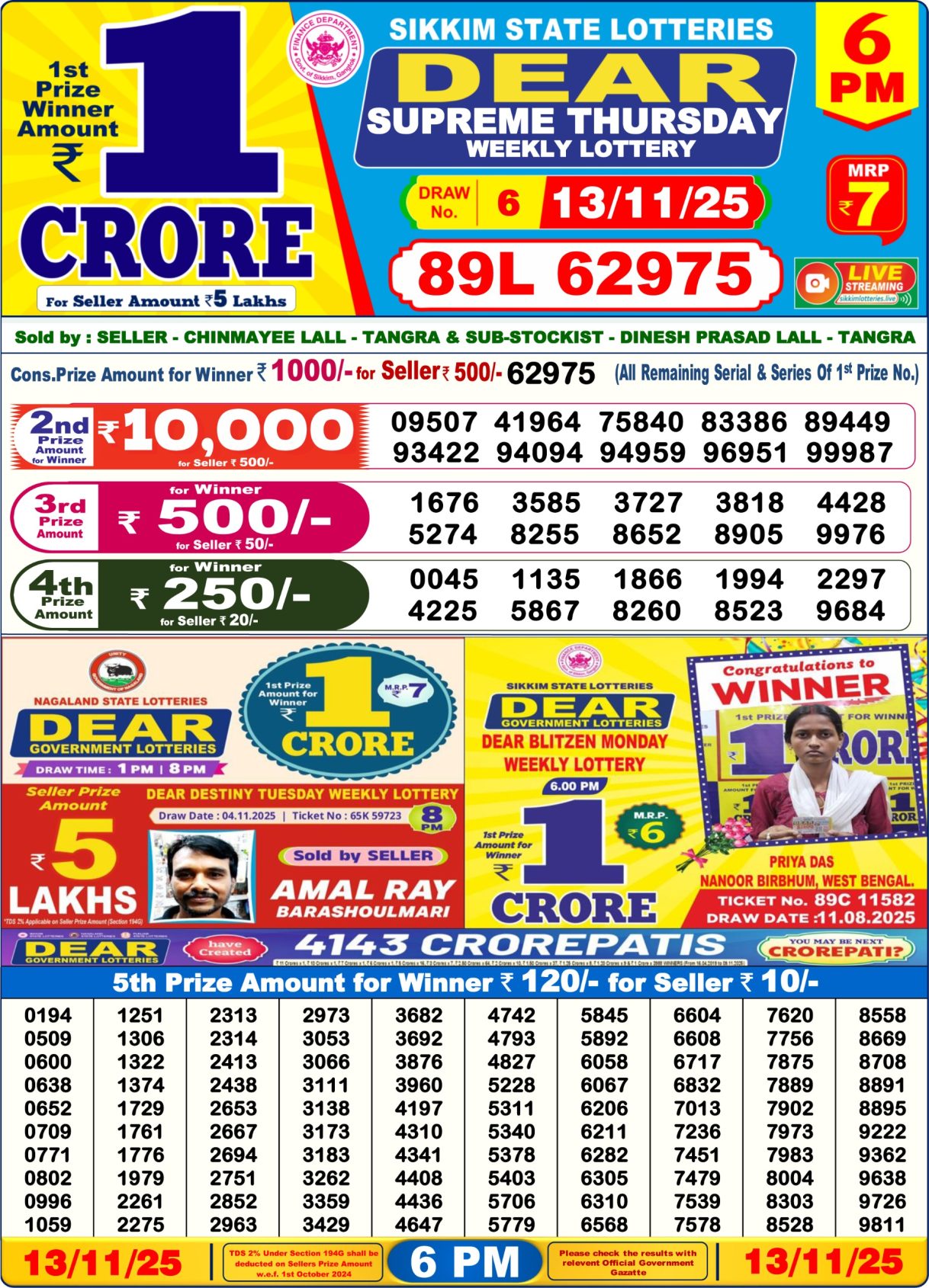 Dear Supreme Lottery 6pm Result 13 November 2025
