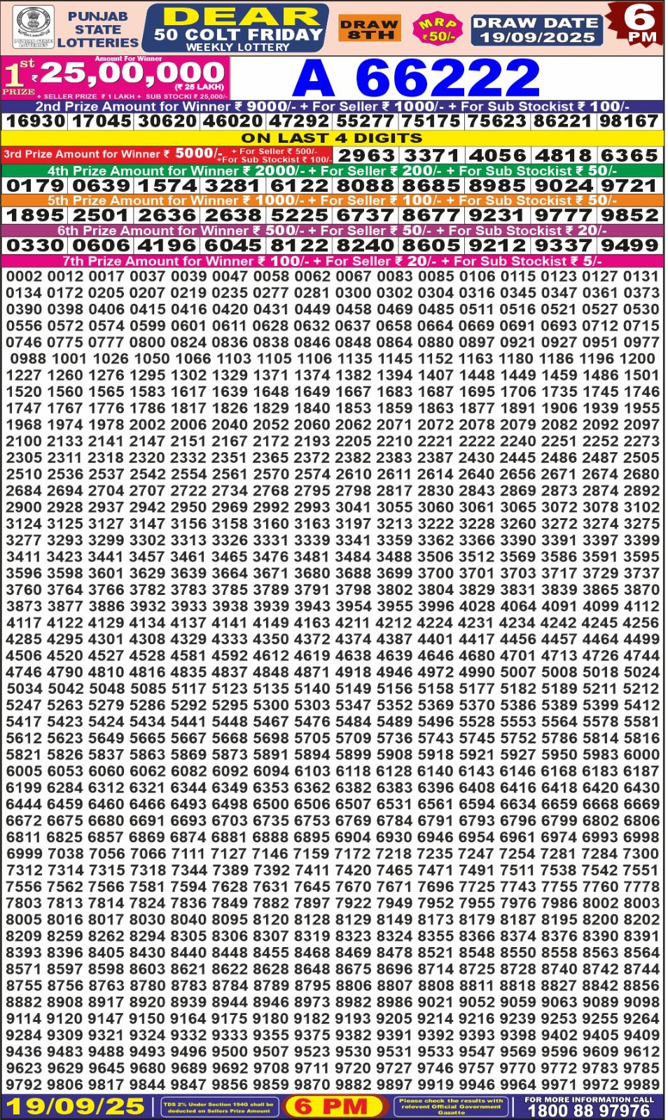 Punjab State Dear 50 6pm Weekly Lottery 19 September 2025
