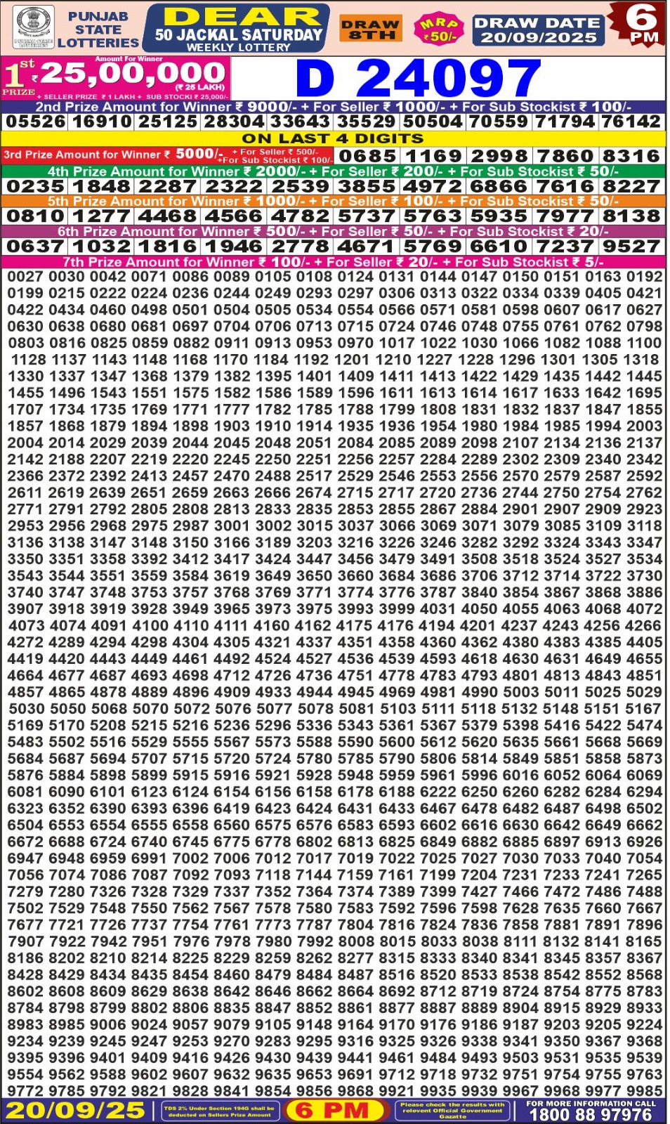 Punjab State Dear 50 6pm Weekly Lottery 20 September 2025