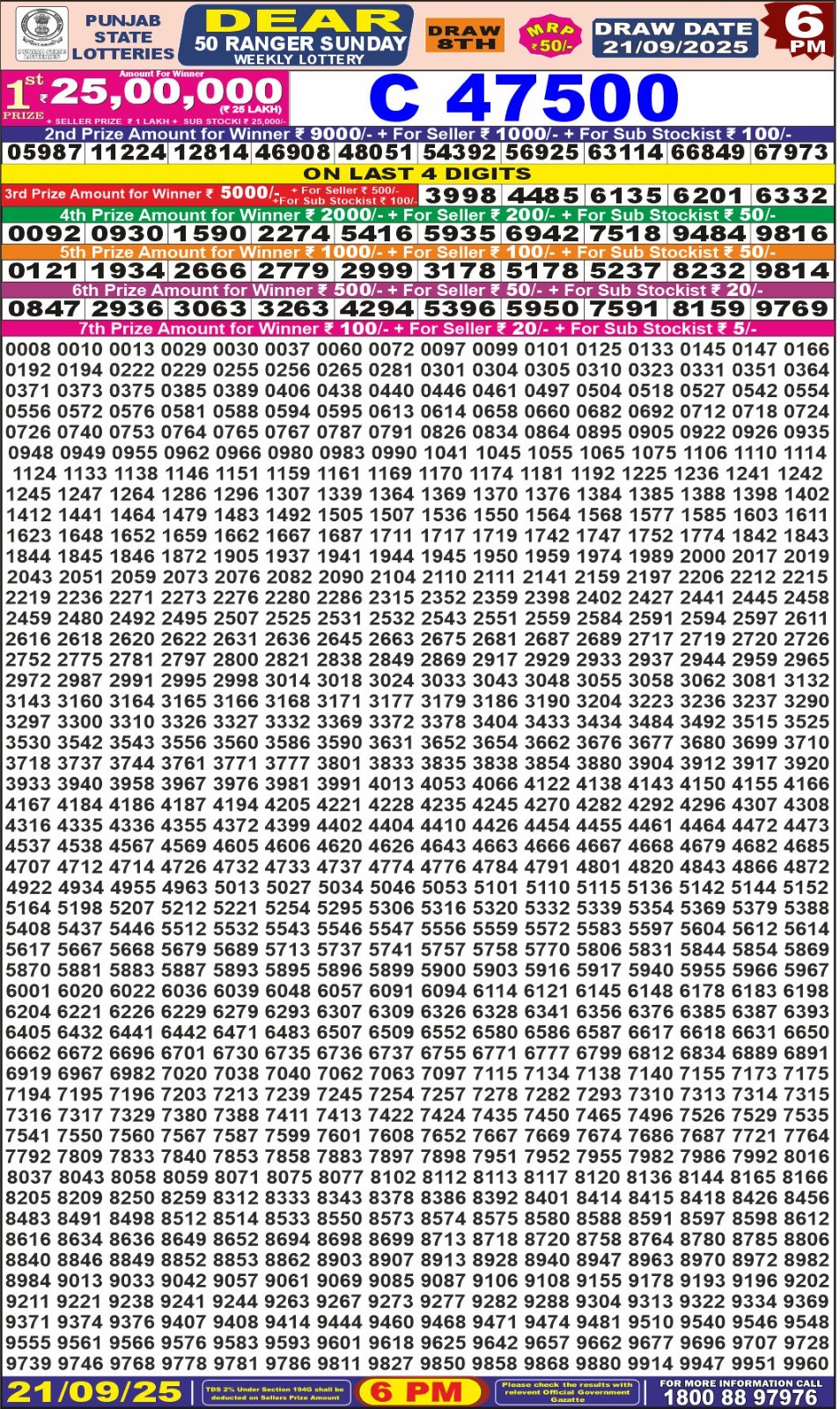 Punjab State Dear 50 6pm Weekly Lottery 21 September 2025