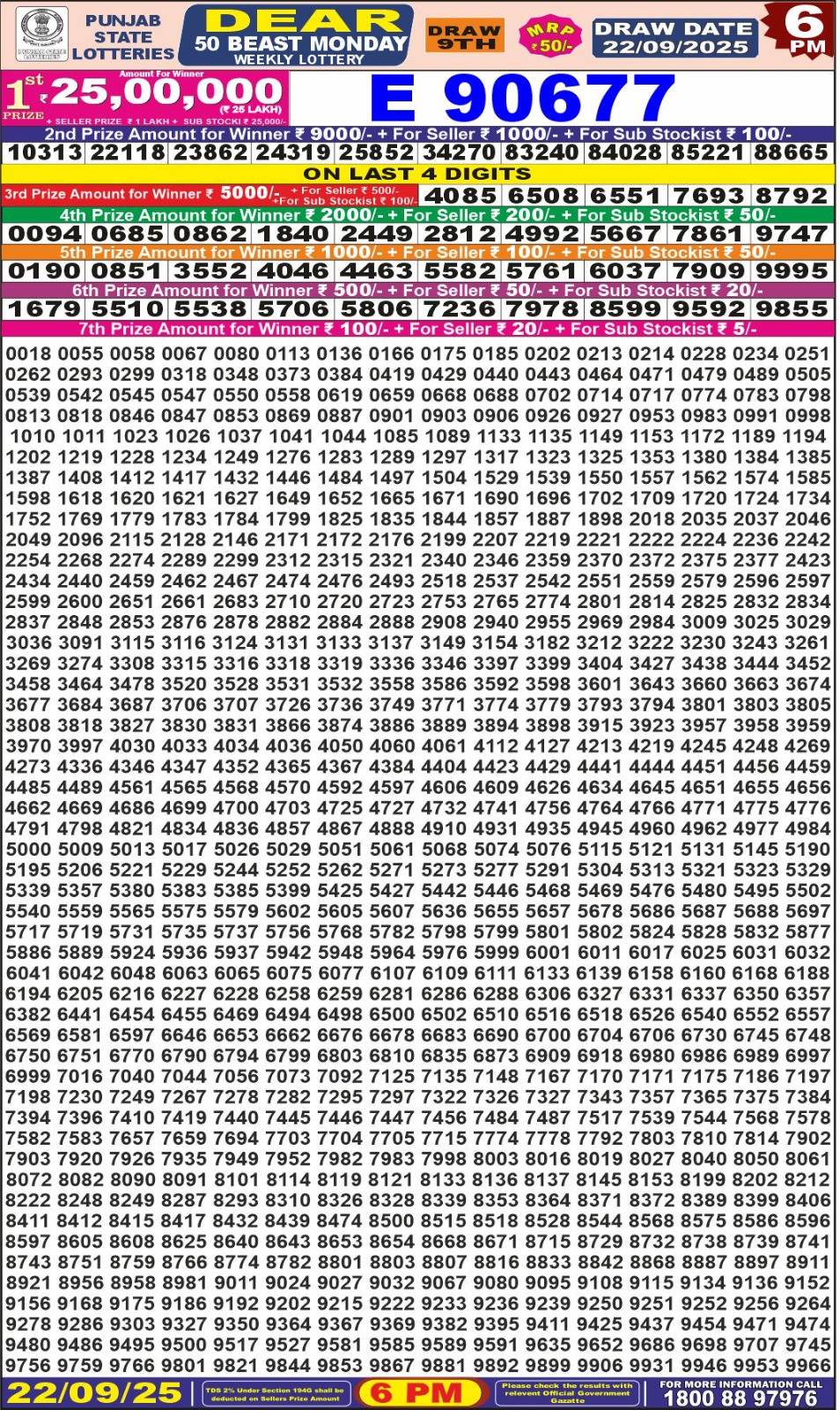 Punjab State Dear 50 6pm Weekly Lottery 09 September 2025