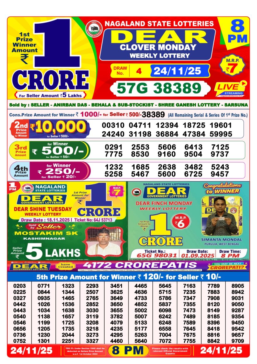 Dear Clover Lottery 8pm Daily Result 24 November 2025 Recent Results 0 4 Dear Horizon Lottery 8pm Daily Result 9 January 2026 0 3 Dear Crown Lottery 6pm Result 9 January 2026 0 4 Labhlaxmi Glow Lottery 4pm Daily Result 9 January 2026 0 3 Dear Victory Lottery 1pm Daily Result 9 January 2026