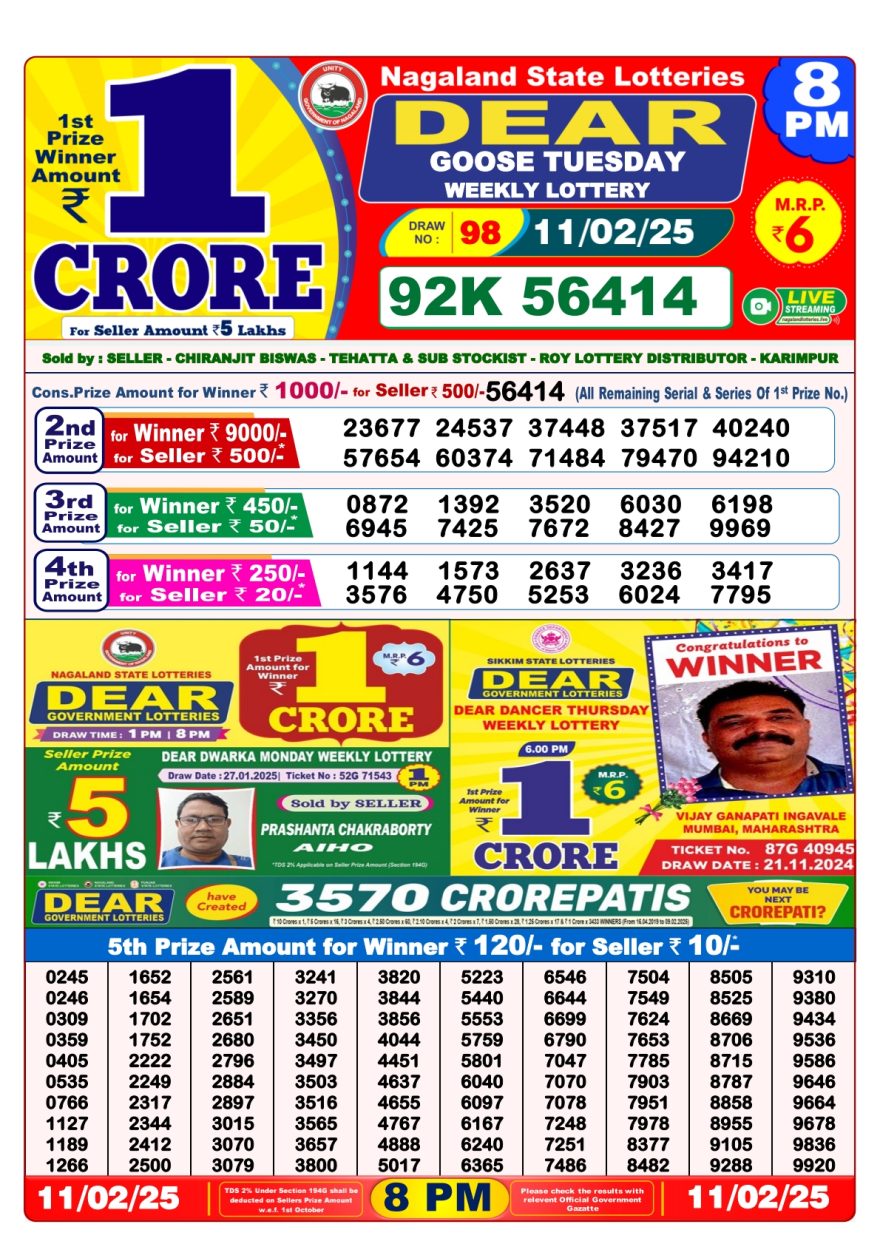 Dear goose Lottery 8PM Daily Result 11 Feb 2025 Recent Results 0 1 Dear Magic Lottery Result 8pm 14 December 2025 0 2 Dear Empire Lottery 6pm Result 14 December 2025 0 1 Labhlaxmi Power Lottery 4pm Daily Result 14 December 2025 0 2 Dear Wish Lottery 1pm Daily Result 14 December 2025