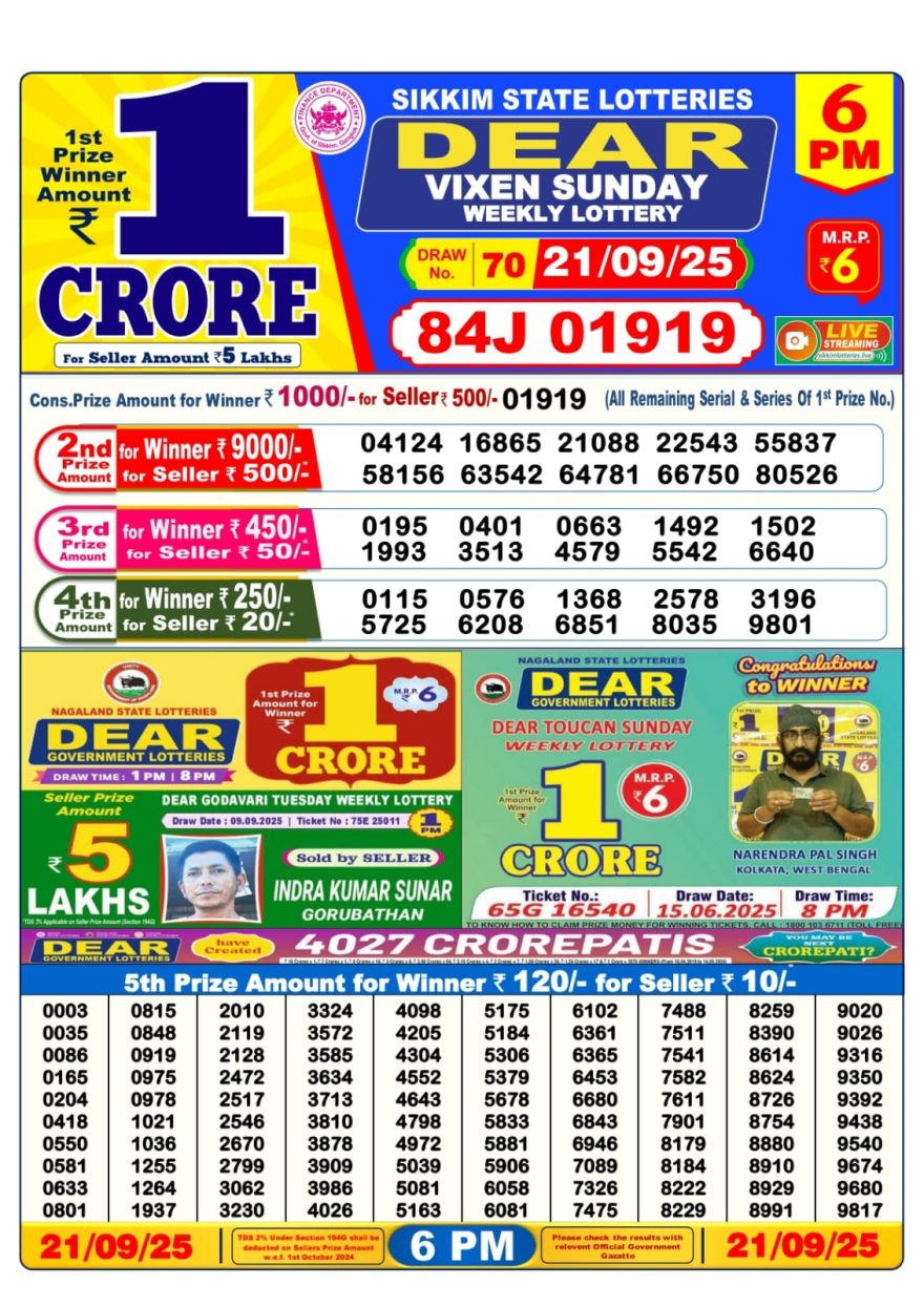 Dear Vixen Lottery 6pm Result 21 September 2025 Recent Results 0 14 Dear Dream Lottery 8pm Daily Result 5 November 2025 0 14 Dear Regal Lottery 6pm Result 5 November 2025 0 12 Labhlaxmi Delight Lottery 4pm Daily Result 5 November 2025 0 15 Dear Destiny Lottery 8pm Daily Result 4 November 2025