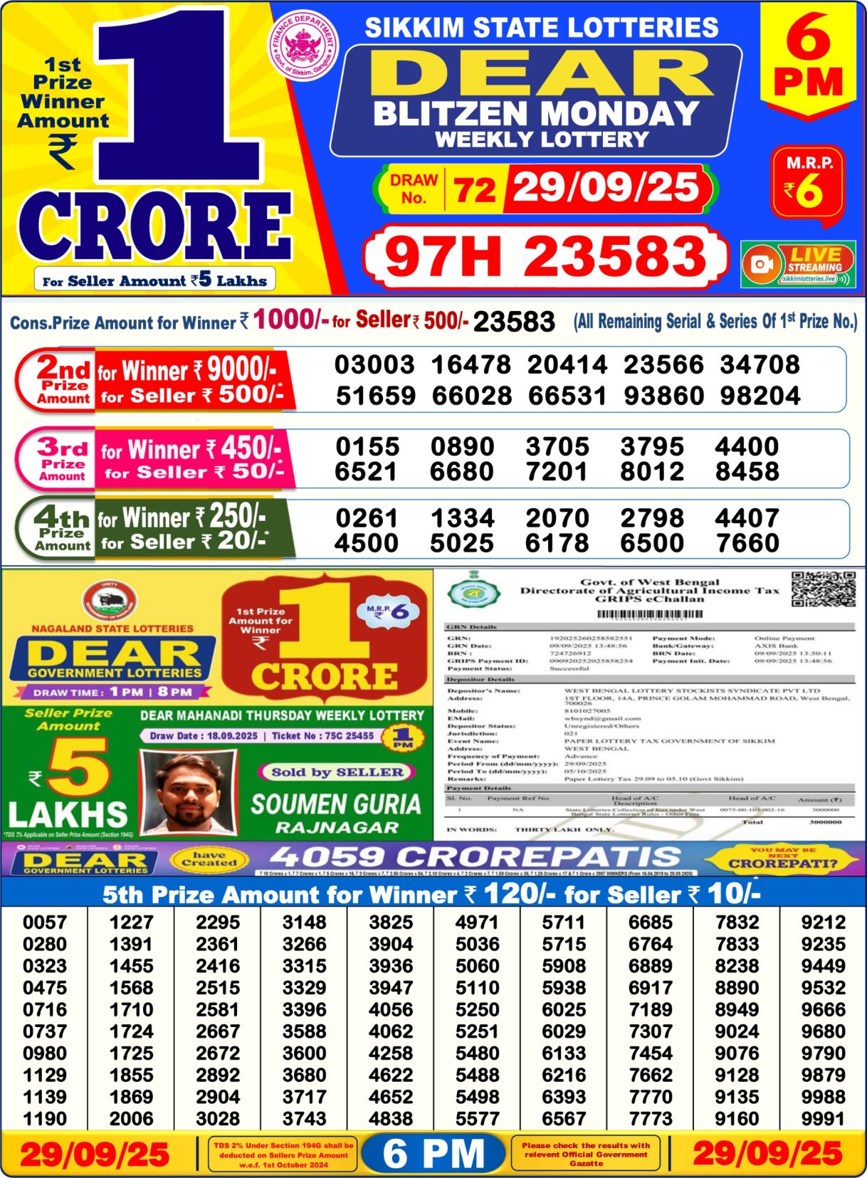 Dear Blitzen Lottery 6pm Result 29 September 2025