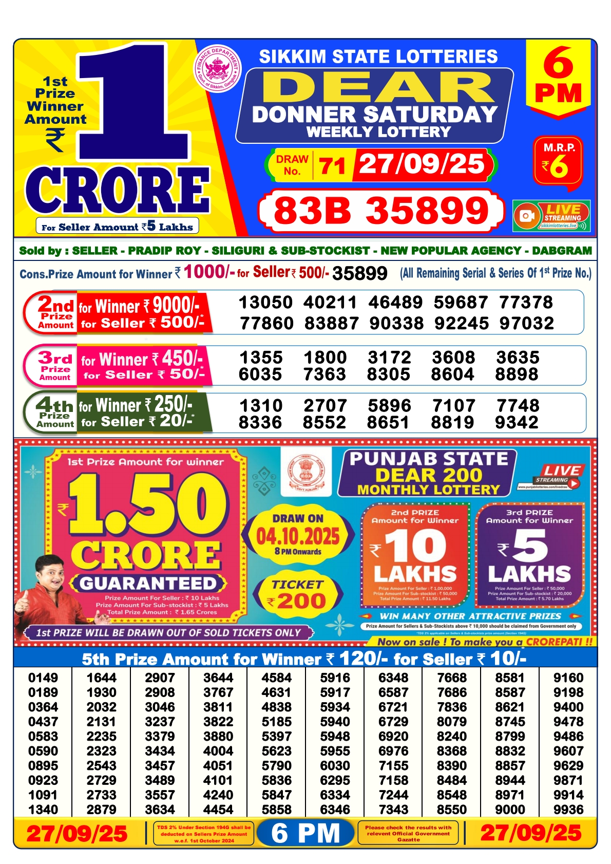 Punjab State Dear 50 6pm Weekly Lottery 27 September 2025