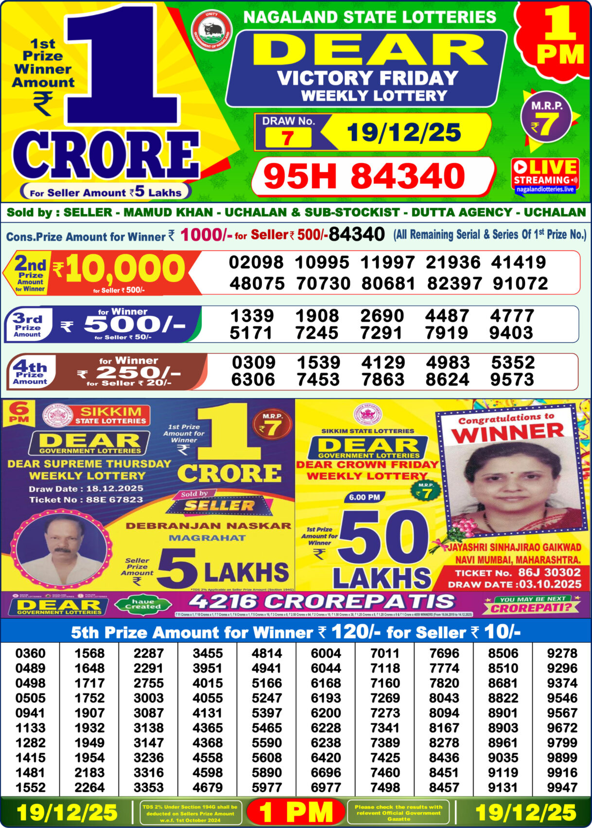 Dear Victory Lottery 1pm Daily Result 19 December 2025