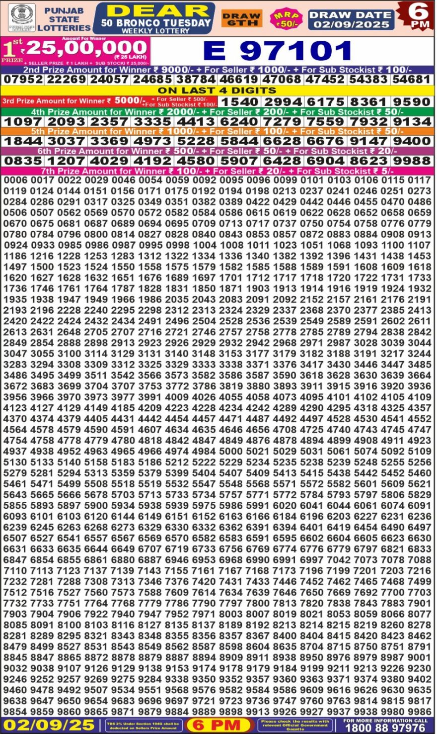 Punjab State Dear 50 6pm Weekly Lottery 02 September 2025 Recent Results 0 8 Punjab State Dear 50 6pm Weekly Lottery 01 November 2025 0 18 Punjab State Dear 50 6pm Weekly Lottery 31 October 2025 0 25 Punjab State Dear 50 6pm Weekly Lottery 30 October 2025 0 36 Punjab State Dear 50 6pm Weekly Lottery 29 October 2025