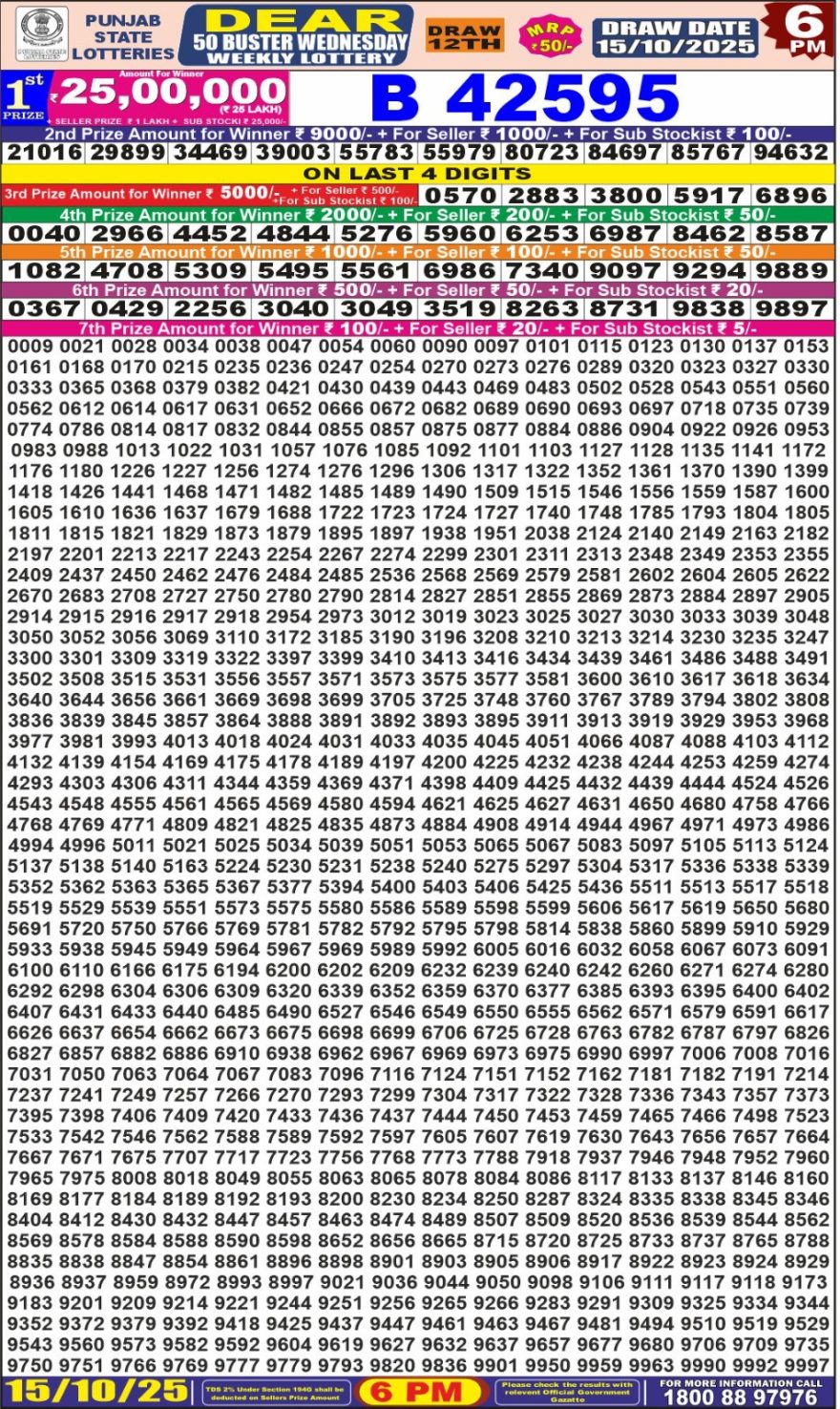 Punjab State Dear 50 6pm Weekly Lottery 15 October 2025 Recent Results 0 2 Punjab State Dear 50 6pm Weekly Lottery 3 December 2025 0 11 Punjab State Dear 50 6pm Weekly Lottery 2 December 2025 0 23 Punjab State Dear 50 6pm Weekly Lottery 01 December 2025 0 29 Punjab State Dear 50 6pm Weekly Lottery 30 November 2025