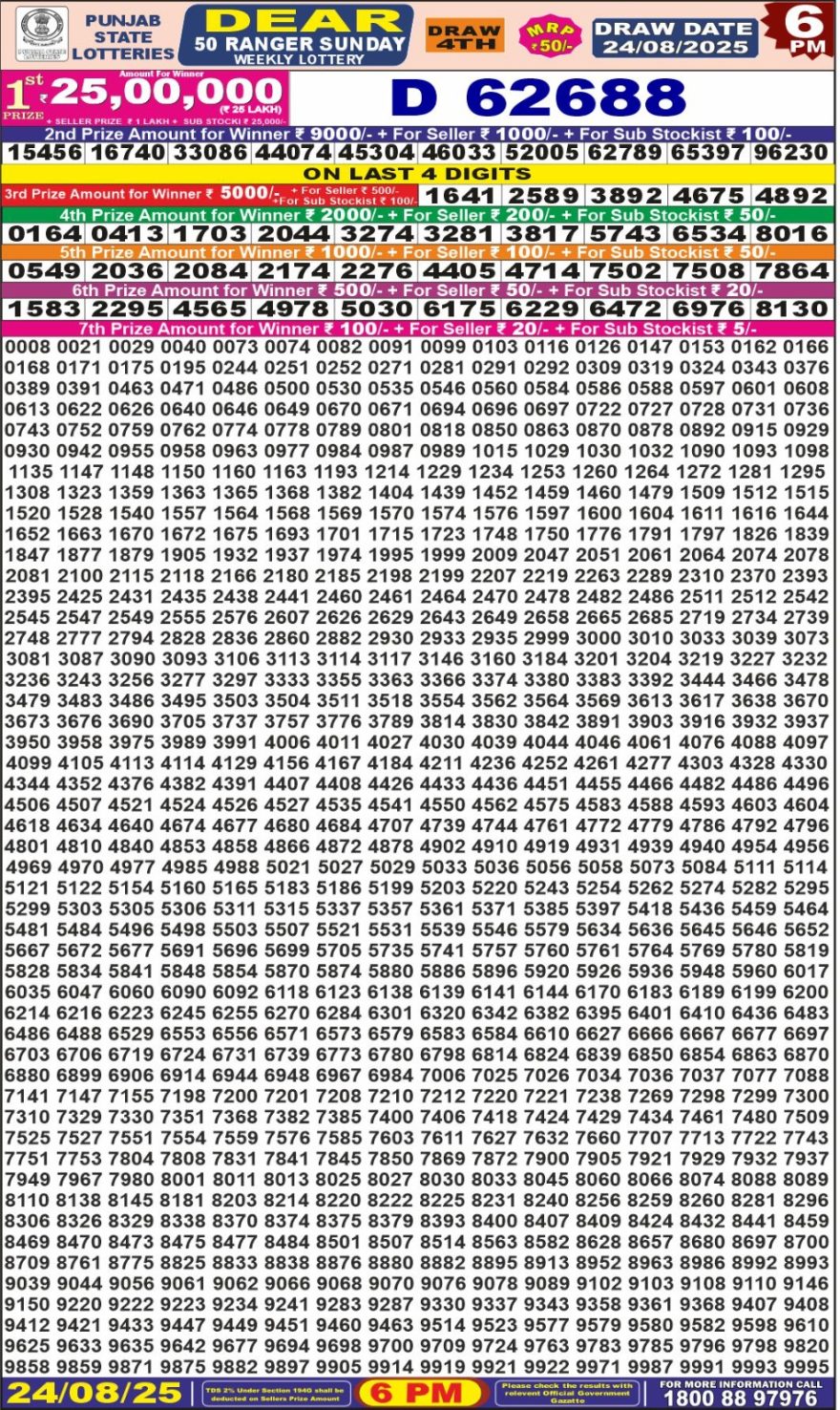 Punjab State Dear 50 6pm Weekly Lottery 24 August 2025 Recent Results 0 12 Punjab State Dear 50 6pm Weekly Lottery 12 December 2025 0 20 Punjab State Dear 50 6pm Weekly Lottery 11 December 2025 0 29 Punjab State Dear 50 6pm Weekly Lottery 10 December 2025 0 28 Punjab state 100 Monthly Lottery Result published 09 December 2025