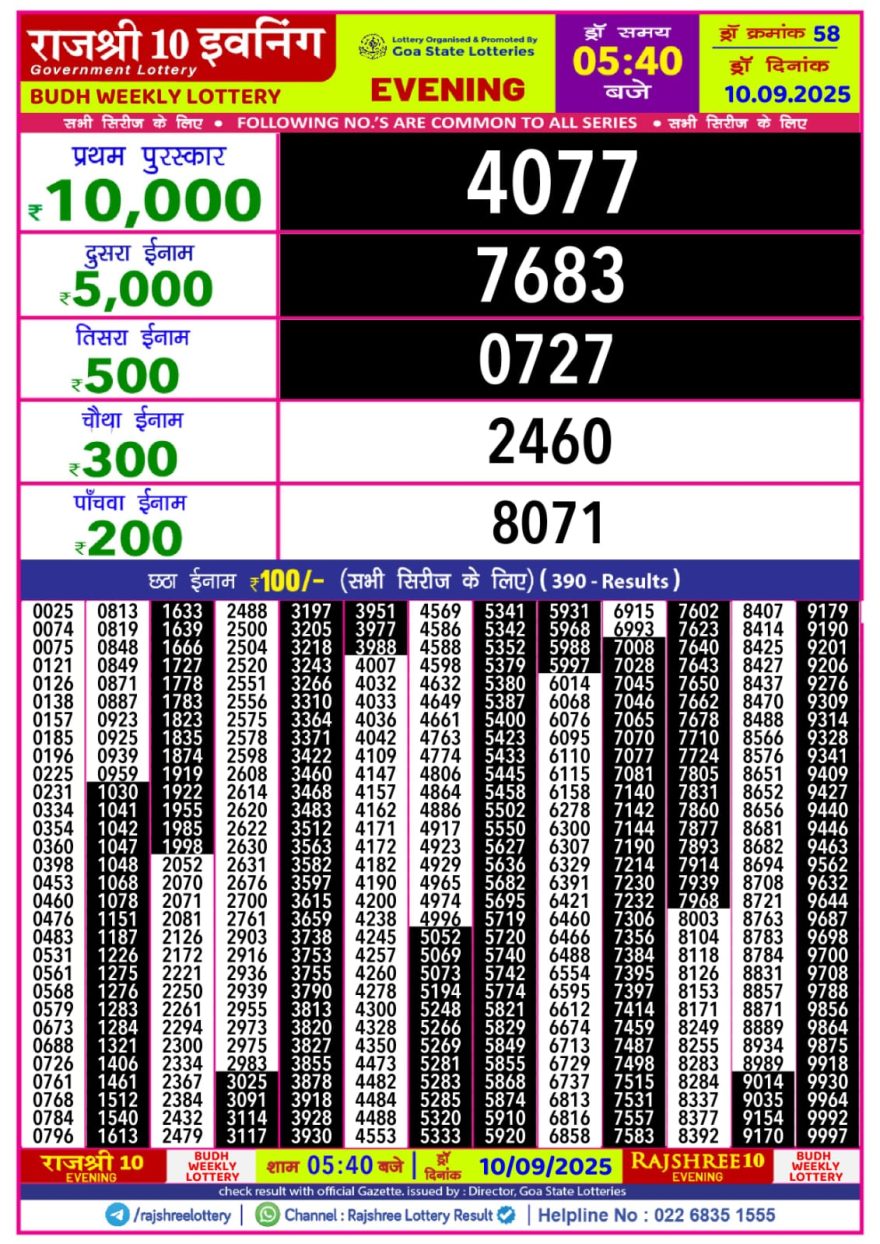 Rajshree 10 Evening Weekly 5:40 pm Lottery Result 10 September 2025 Recent Results 0 2 Rajshree 30 Lottery 8:30pm Daily Result 02 November 2025 0 2 Rajshree 50 Lottery 7:30pm Daily Result 02 November 2025 0 2 Rajshree 10 Evening Weekly 5:40 pm Lottery Result 02 November 2025 0 2 Rajshree Sunflower Lottery 4pm Daily Result 02 November 2025