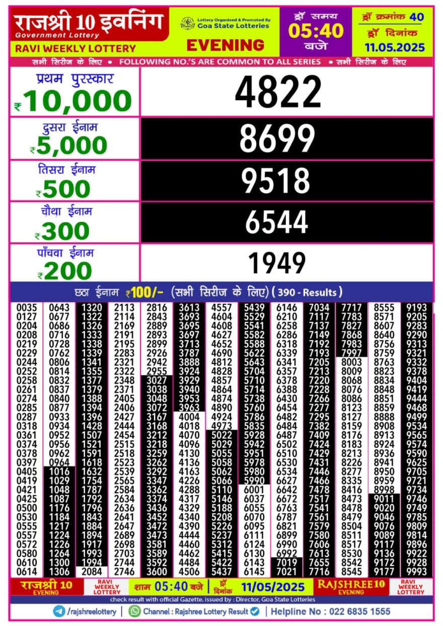 Rajshree 10 Evening Weekly 5:40 pm lottery result 11 May 2025 Recent Results 0 3 Rajshree Lottery 8pm Daily Result 14 December 2025 0 2 Rajshree 50 Lottery 7:30pm Daily Result 14 December 2025 0 4 Rajshree 10 Evening Weekly 5:40 pm Lottery Result 14 December 2025 0 4 Rajshree Ravi Lottery 1pm Daily Result 14 December 2025
