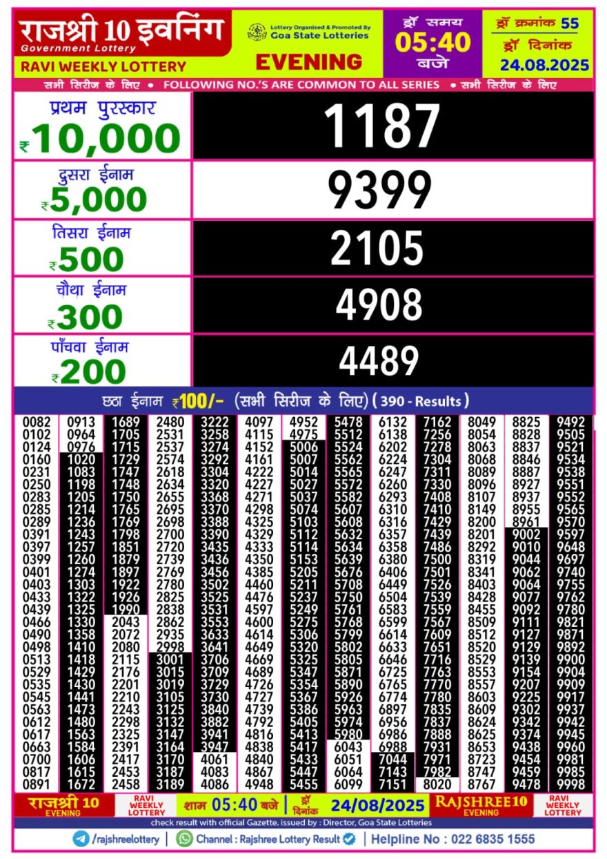 Rajshree 10 Evening Weekly 5:40 pm Lottery Result 24 August 2025 Recent Results 0 11 Rajshree 50 Lottery 7:30pm Daily Result 15 October 2025 0 11 Rajshree Lottery 8pm Daily Result 15 October 2025 0 12 Rajshree 10 Evening Weekly 5:40 pm Lottery Result 15 October 2025 0 12 Rajshree Lily Lottery 4pm Daily Result 15 October 2025