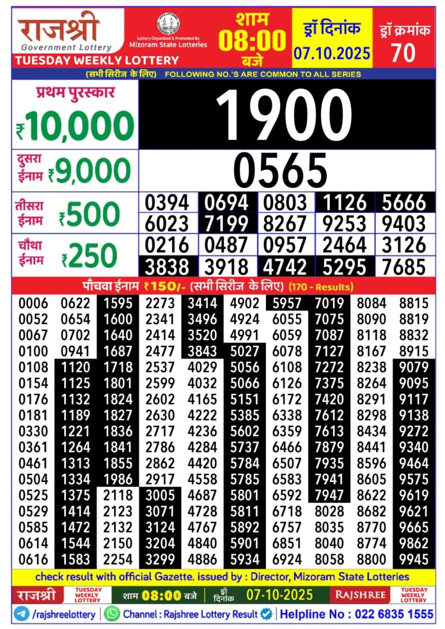 Rajshree Lottery 8pm Daily Result 07 October 2025 Recent Results 0 4 Rajshree Lottery 8pm Daily Result 30 November 2025 0 5 Rajshree 50 Lottery 7:30pm Daily Result 30 November 2025 0 5 Rajshree 10 Evening Weekly 5:40 pm Lottery Result 30 November 2025 0 4 Rajshree Ravi Lottery 1pm Daily Result 30 November 2025
