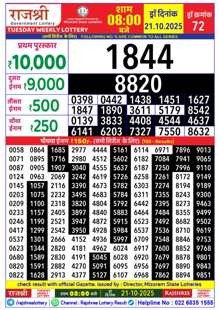 Rajshree Lottery 8pm Daily Result 21 October 2025 Recent Results 0 11 Rajshree Lottery 8pm Daily Result 07 December 2025 0 9 Rajshree 50 Lottery 7:30pm Daily Result 07 December 2025 0 12 Rajshree 10 Evening Weekly 5:40 pm Lottery Result 07 December 2025 0 10 Rajshree Ravi Lottery 1pm Daily Result 07 December 2025
