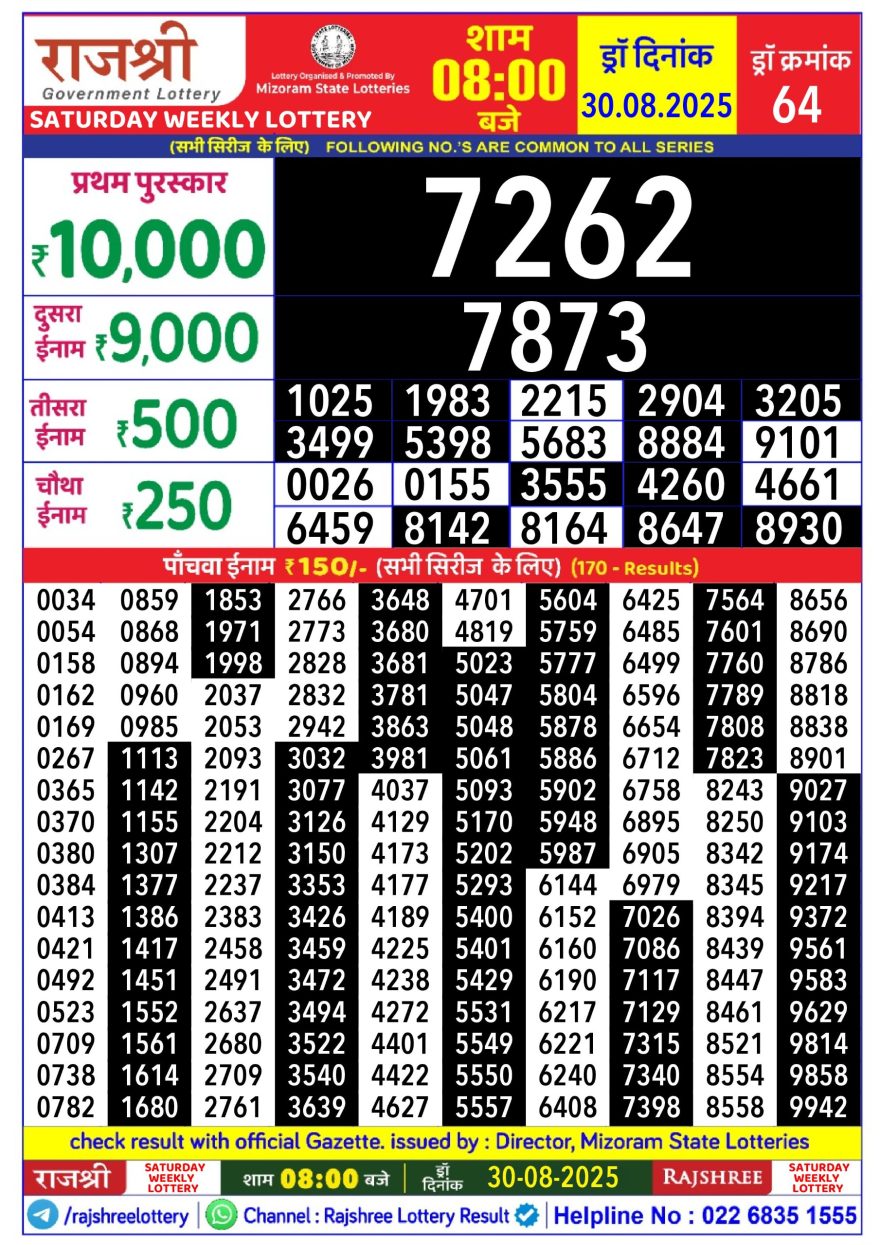 Rajshree Lottery 8pm Daily Result 30 August 2025 Recent Results 0 0 Rajshree Lottery 8pm Daily Result 29 October 2025 0 1 Rajshree 10 Evening Weekly 5:40 pm Lottery Result 29 October 2025 0 0 Rajshree Lily Lottery 4pm Daily Result 29 October 2025 0 1 Rajshree Budh Lottery 1pm Daily Result 29 October 2025