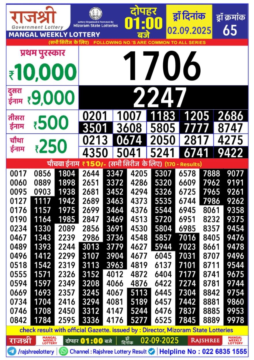 Rajshree Mangal Lottery 1pm Daily Result 02 September 2025 Recent Results 0 5 Rajshree 30 Lottery 8:30pm Daily Result 31 October 2025 0 5 Rajshree 50 Lottery 7:30pm Daily Result 31 October 2025 0 5 Rajshree Lottery 8pm Daily Result 31 October 2025 0 5 Rajshree 10 Evening Weekly 5:40 pm Lottery Result 31 October 2025