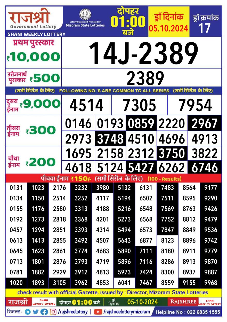 Rajshree shani Lottery 1PM Daily Result 5 oct 2024 Recent Results 0 1 Rajshree Lottery 8pm Daily Result 14 December 2025 0 1 Rajshree 50 Lottery 7:30pm Daily Result 14 December 2025 0 2 Rajshree 10 Evening Weekly 5:40 pm Lottery Result 14 December 2025 0 2 Rajshree Ravi Lottery 1pm Daily Result 14 December 2025
