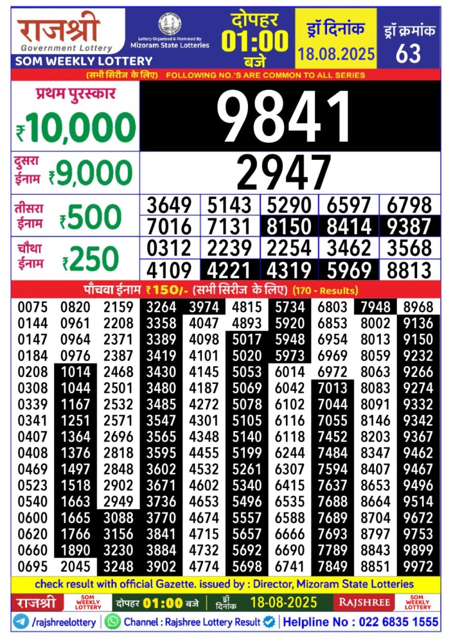 Rajshree Som Weekly Lottery 1pm Result 18 August 2025 Recent Results 0 6 Rajshree 50 Lottery 7:30pm Daily Result 15 October 2025 0 6 Rajshree Lottery 8pm Daily Result 15 October 2025 0 6 Rajshree 10 Evening Weekly 5:40 pm Lottery Result 15 October 2025 0 6 Rajshree Lily Lottery 4pm Daily Result 15 October 2025