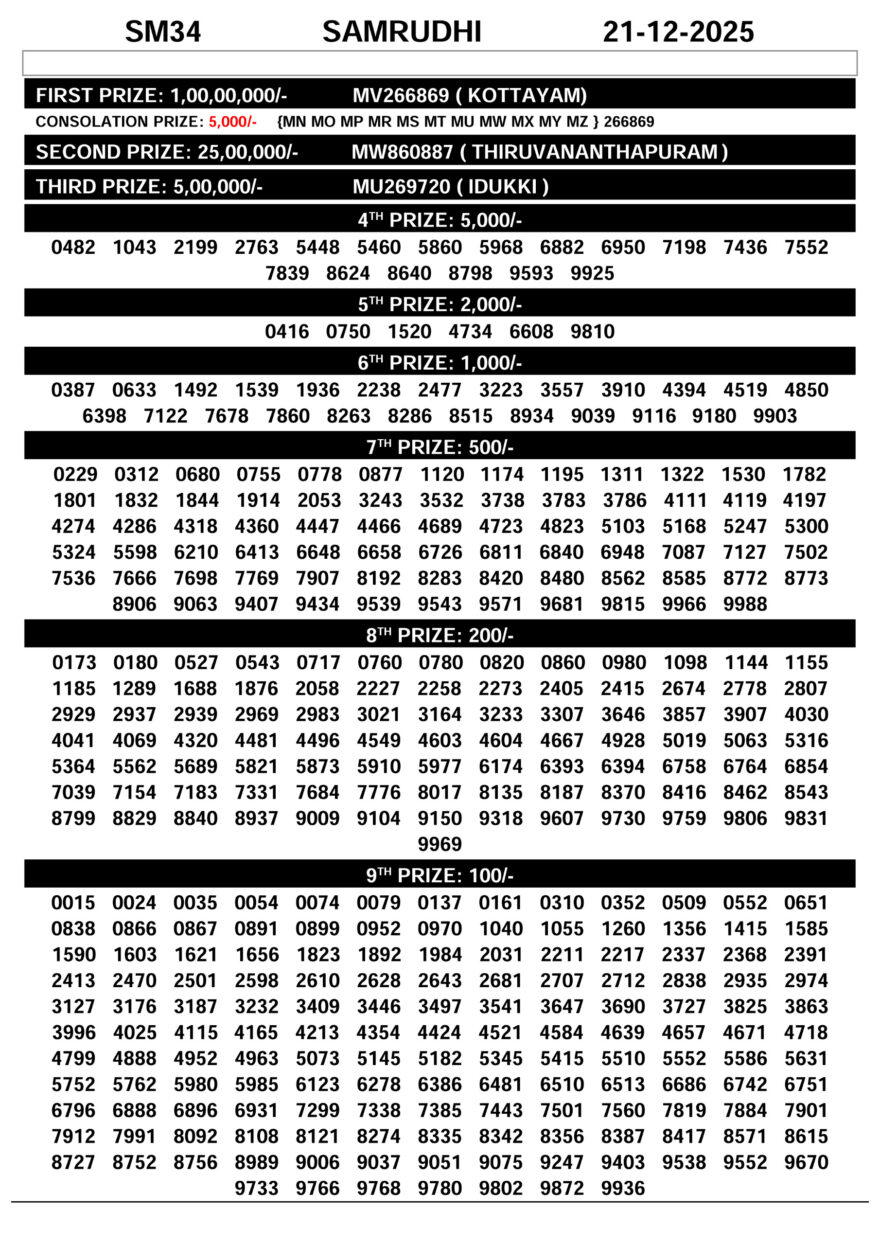 SM 34 Lottery Result 21 December 2025 Kerala State Recent Results 0 11 KR 735 Lottery Result 20 December 2025 Kerala State 0 18 SK 32 Lottery Result 19 December 2025 Kerala State 0 26 KN 602 Lottery Result 18 December 2025 Kerala State 0 33 DL 31 Lottery Result 17 December 2025 Kerala State