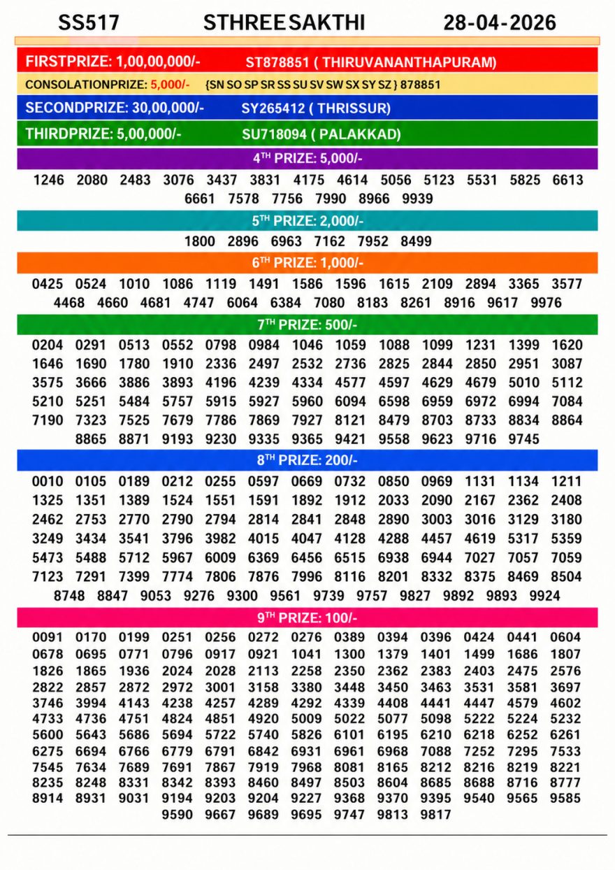 SS 517 Lottery Result 28 April 2026 Kerala State Recent Results 0 22 BT 51 Lottery Result 27 April 2026 Kerala State 0 45 SM 52 Lottery Result 26 April 2026 Kerala State 0 52 KR 751 Lottery Result 25 April 2026 Kerala State 0 64 SK 50 Lottery Result 24 April 2026 Kerala State